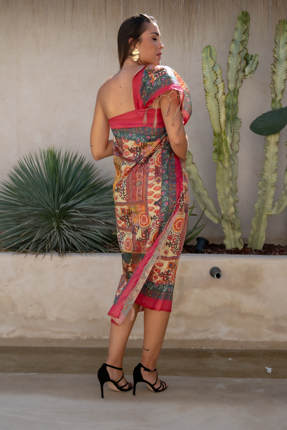 Pareo con flecos hechos con mezcla de seda de assam con estampado patchwork multicolor Sunset & Moon.