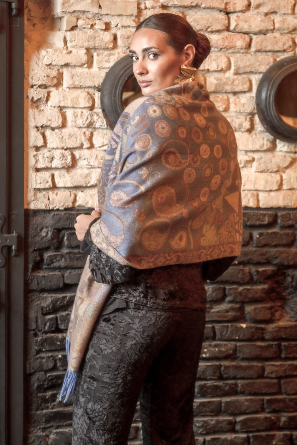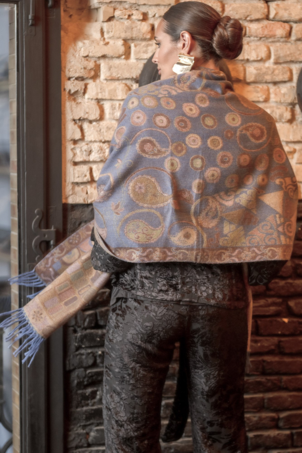 Pasmina Gaudí de estampado abstracto en celeste y verde CALIDAD: 49.3 % viscose.31.3 % polyester. 19.4 % nylon