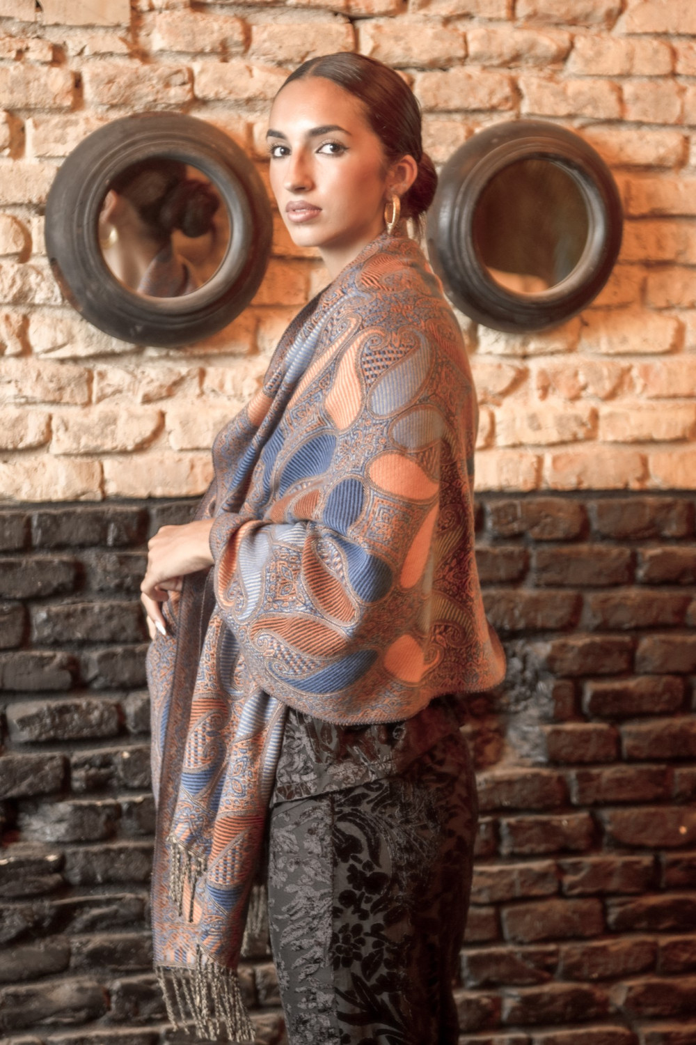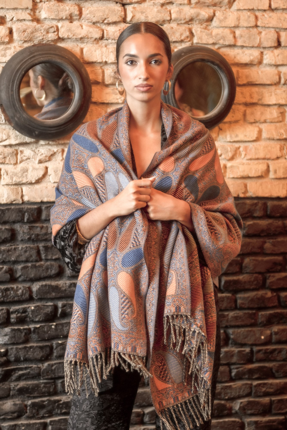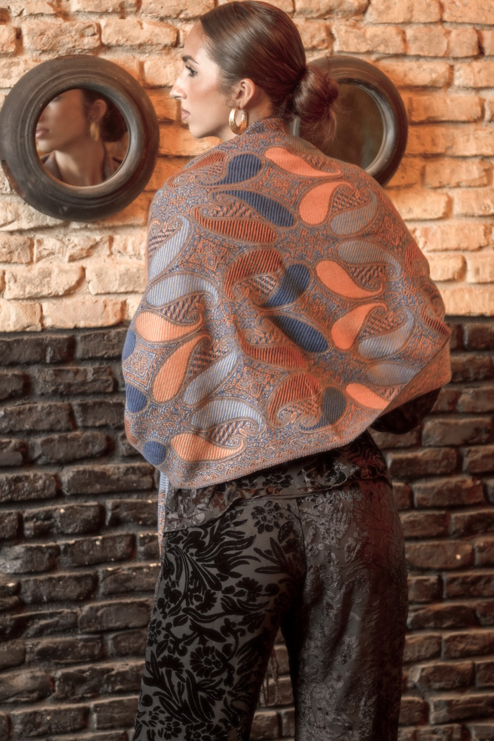 Pasmina Tánger en tonos azules y ocres CALIDAD: 49.3 % viscose.31.3 % polyester. 19.4 % nylon