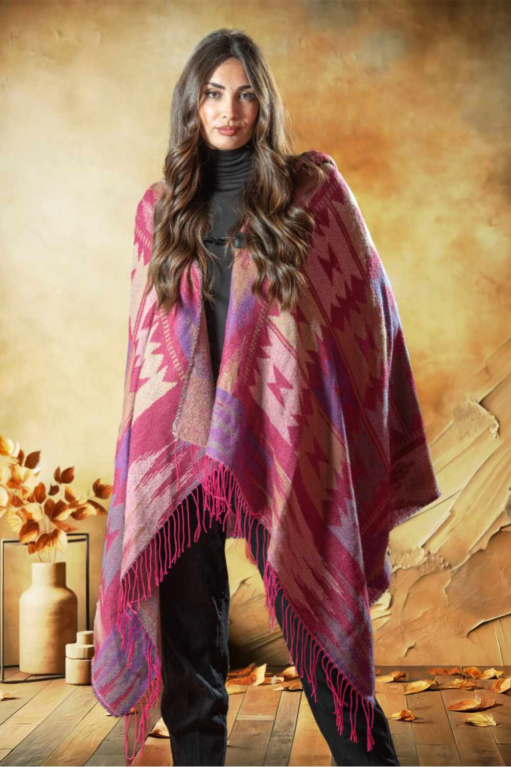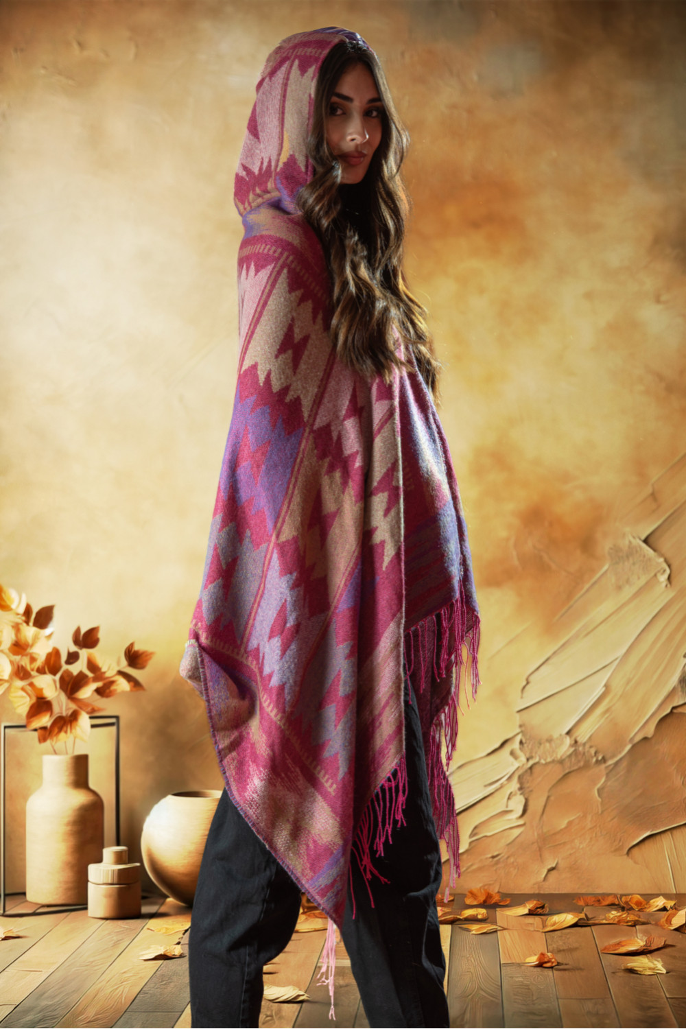 Poncho eclipse capa rectangular con estampado abstracto en tonos rosa, fucsia y lila, lleva capucha y flecos de lmismo tejido en el filo.