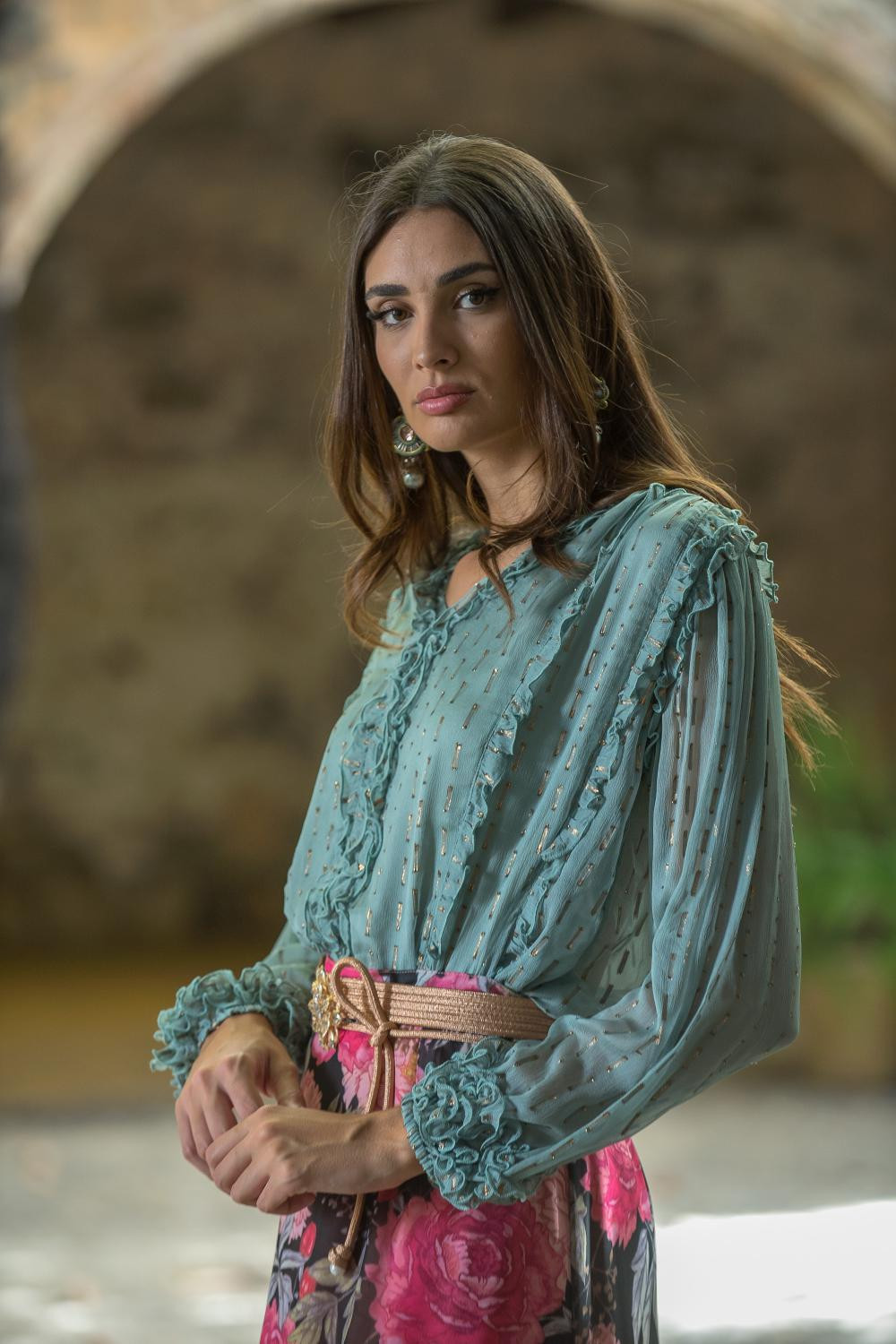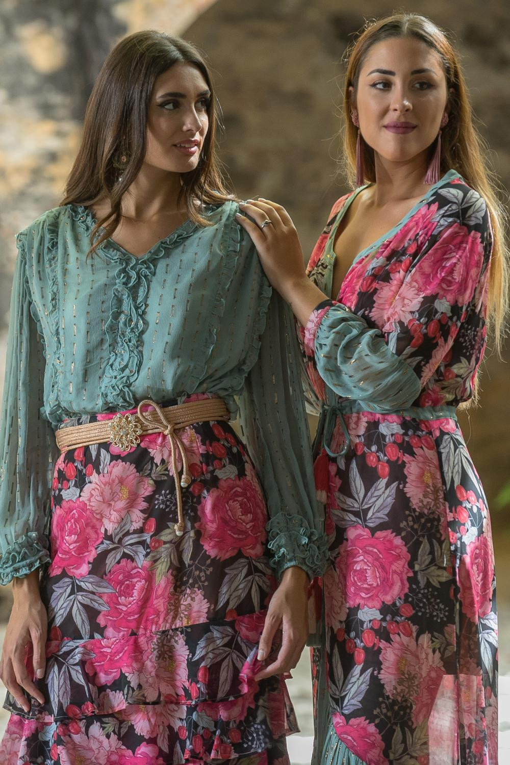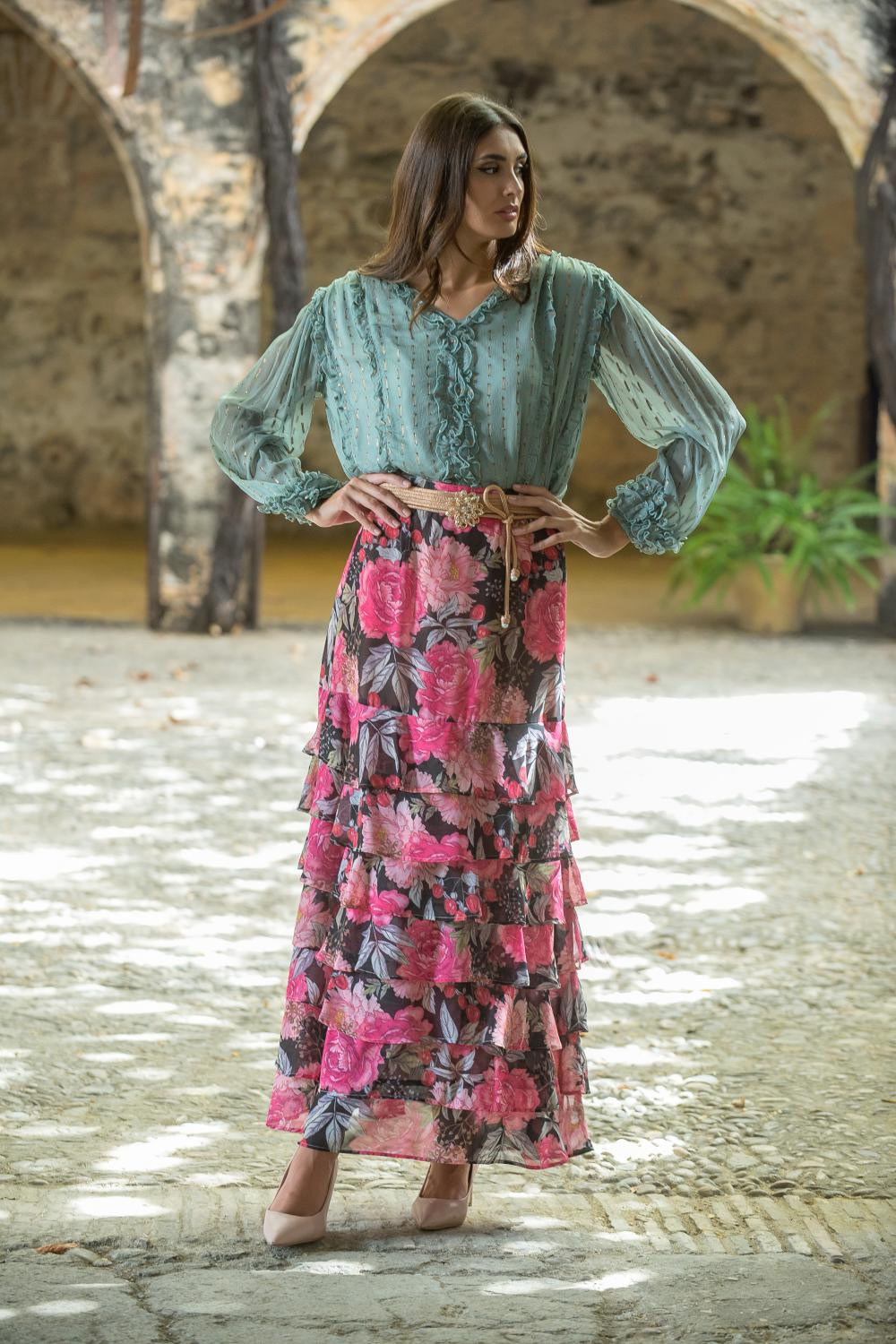 Pantalon verde bordado a tono de flores mantónCalidad: 100% Poliéster - Forro:100% Poliéster punto