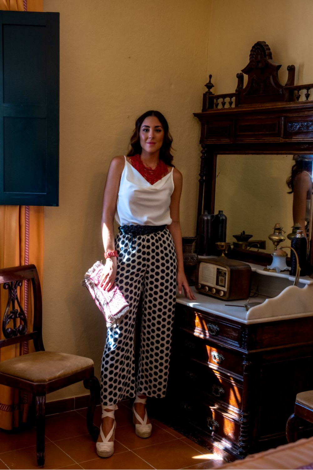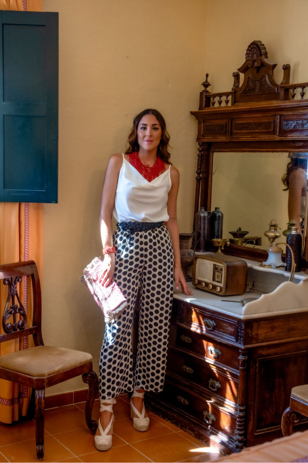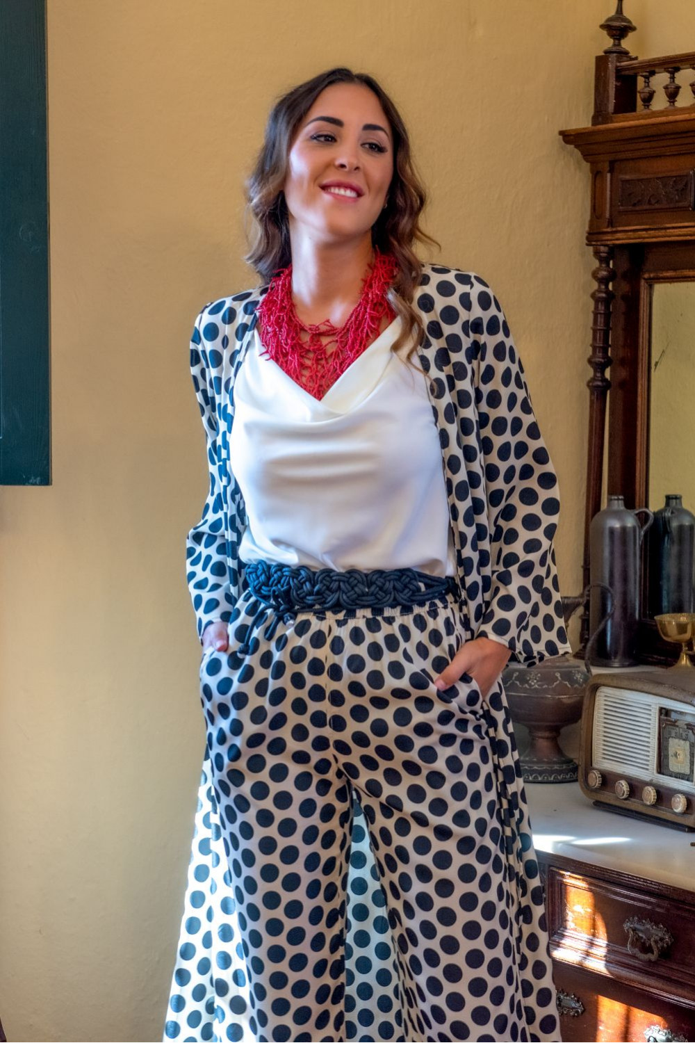 Mono almijar en polysilk estampado geométrico con motivos ornamentales bicolor en beige y negro, sin mangas con doble volante en el hombro, cintura fruncida escote cruzado delante y en la espalda.CALIDAD: 70%...
