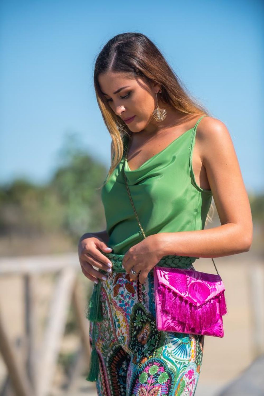 Top sol buganvilla sunset & moon polysilk con tirantas y cuello bocón.CALIDAD: 70% POLIESTER 30% SEDA