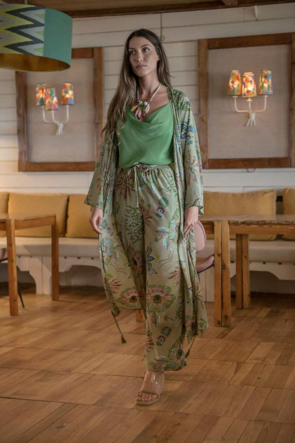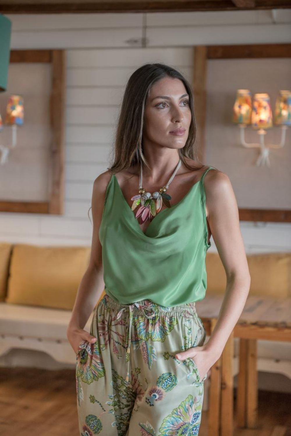 Top sol verde agua sunset & moon polysilk con tirantas y cuello bocón.
