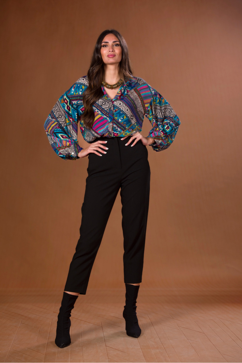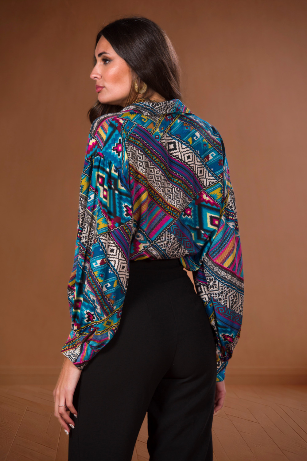 TOP GRAVINA MOSAICO DE POLIESTER EN ESTAMPADO MULTICOLOR TURQUESA Y ROSA CUADROS ABSTRACTOS