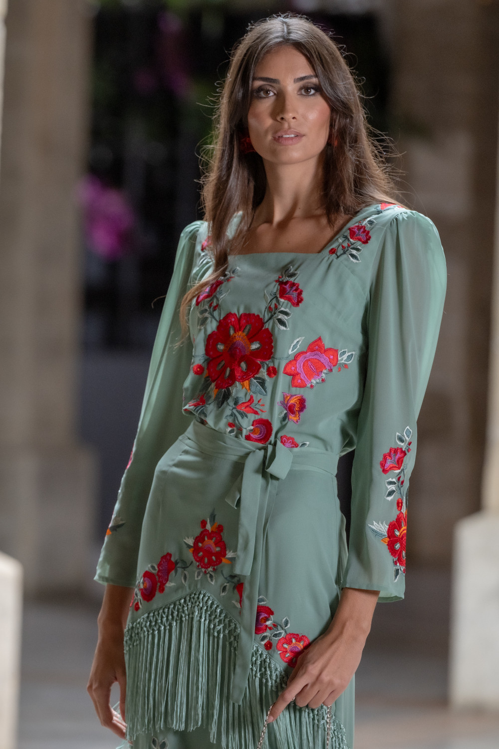 Bolso verde bordado flores mantón multicolor con flecos y asa de cadena. Calidad: 100% Poliéster - Forro: 100% Poliéster - Flecos: 100% Viscosa