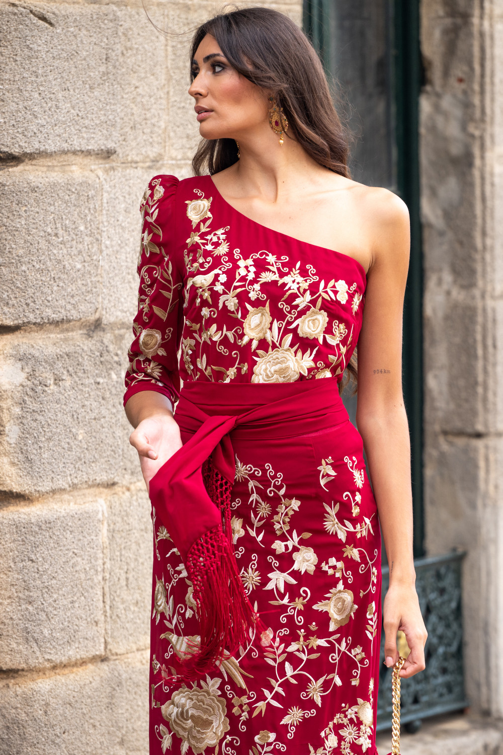 Top asimétrico burdeos bordado de flores mantón y pájaros, manga fruncido al hombro, francesa.