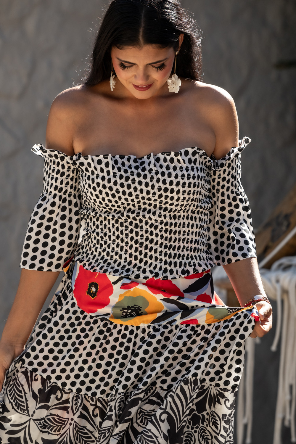 Falda Pareo con volantes superpuestos en polisilk combinando lunares y amapolas en tonos rojo y amarillo Sunset & Moon.Calidad: 70% Poliéster 30% seda