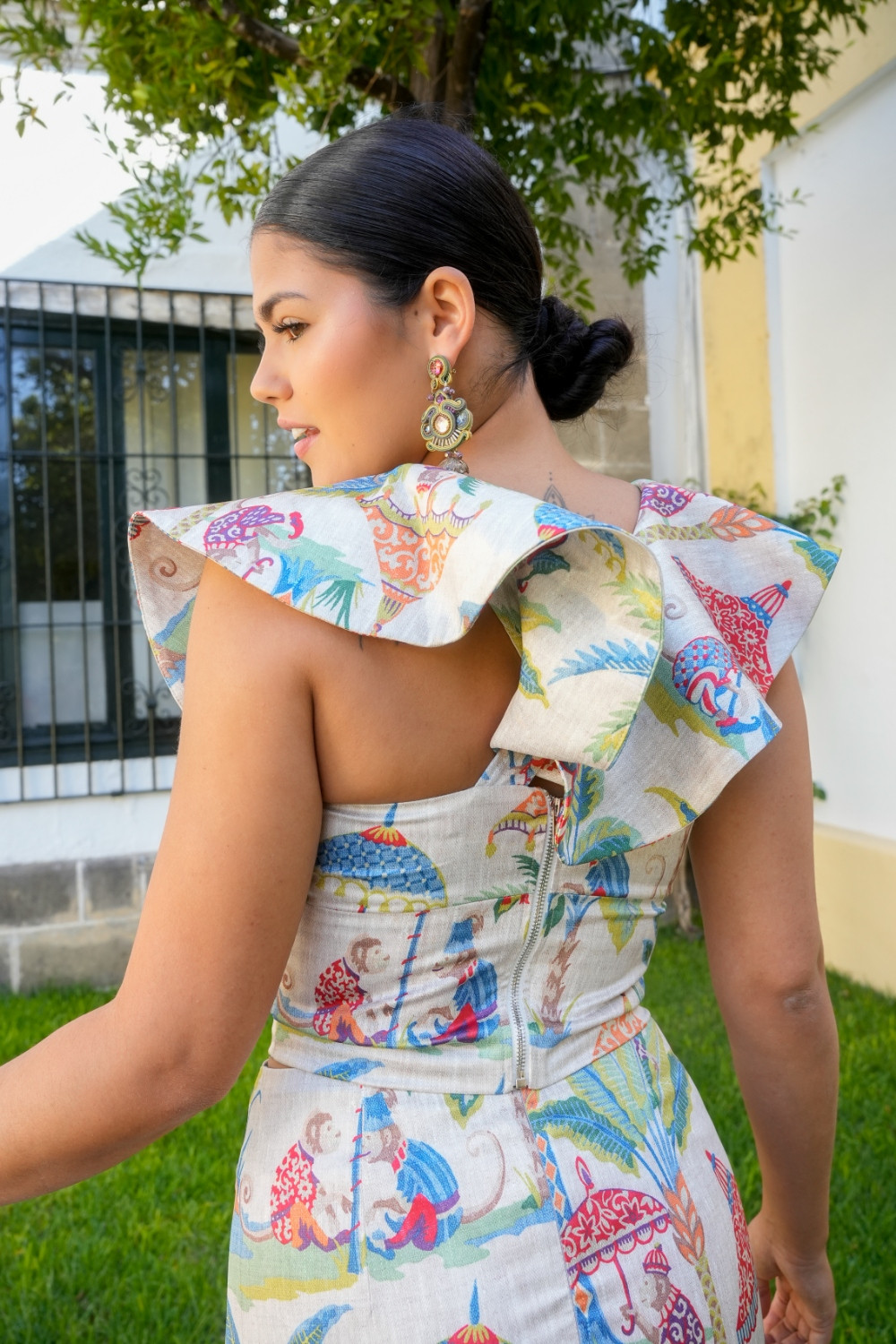 Top Magía Monos de poliestre estampado sin manga. amplio volante que cruza en la espalda Káhyra. COMPOSICIÓN: 100%POLIÉSTER FORRO: 100%POLIÉSTER