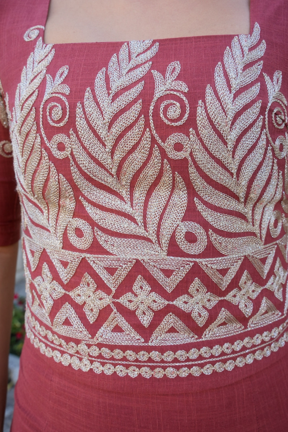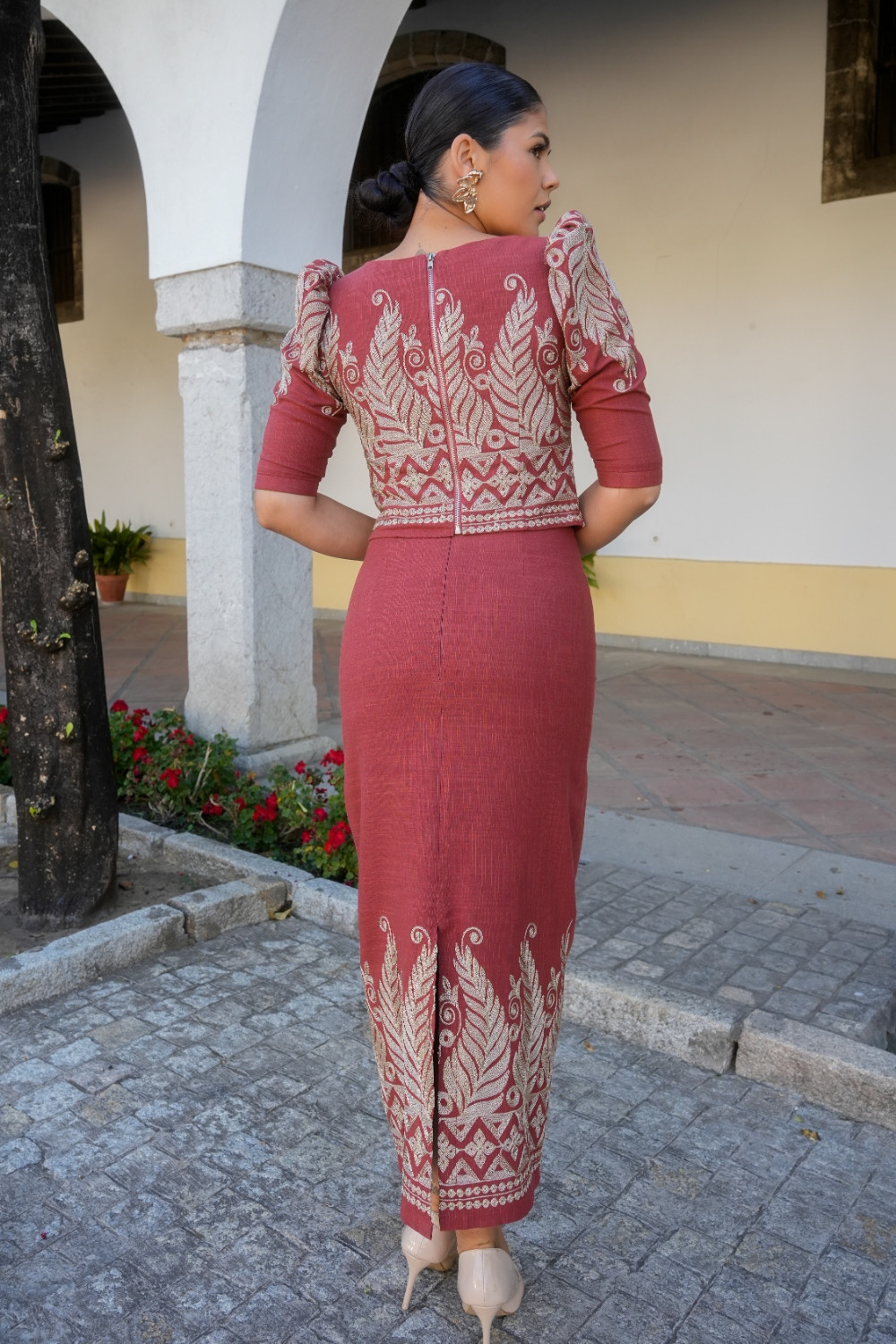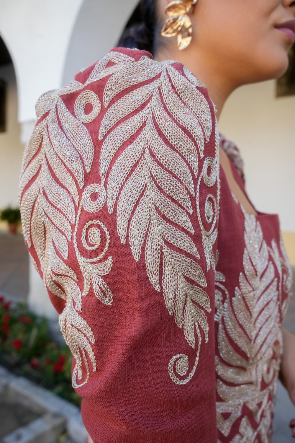 Top Tarantela de lino marrón con bordado geometrico en dorado escote cuadrado manga corta globo kahyra. COMPOSICIÓN: 70%VISCOSA.30%LINO FORRO: 80%POLIÉSTER.20%ALGODON