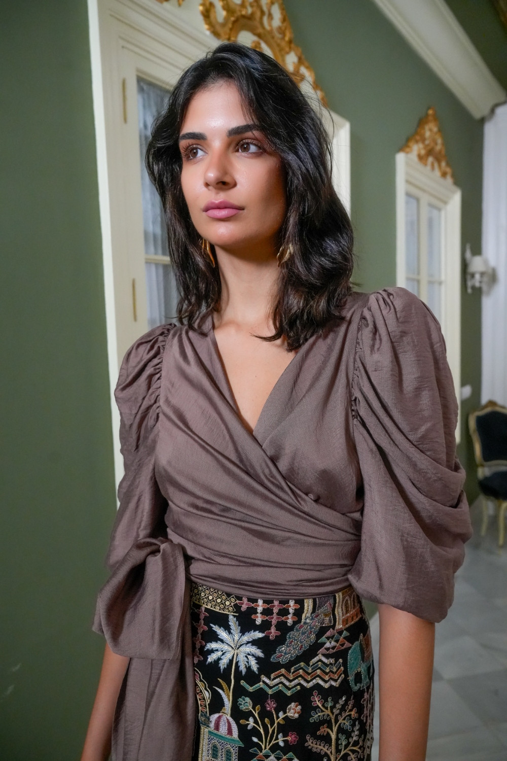 Top Dulzura taupe cruzado anudado con fajin ancho a la cintura. manga francesa globo fruncida y fajin Káhyra. COMPOSICIÓN: 80%VISCOSA.20%POLIÉSTER