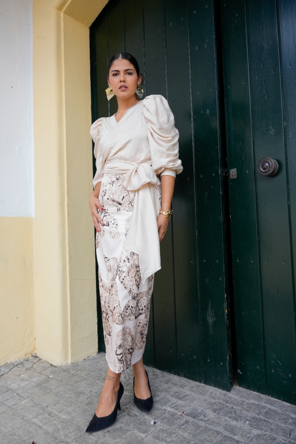 Top Dulzura marfil cruzado anudado con fajin ancho a la cintura. manga francesa globo fruncida y fajin Káhyra. COMPOSICIÓN: 80%VISCOSA.20%POLIÉSTER