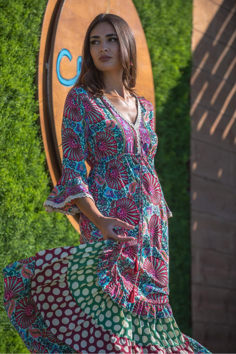 Vestido largo estampado Bulería verde con flores campanas buganvillas, bolillo en escote de pico , y filo volante de la manga al codo, volantes en falda con lunares verde y burdeos