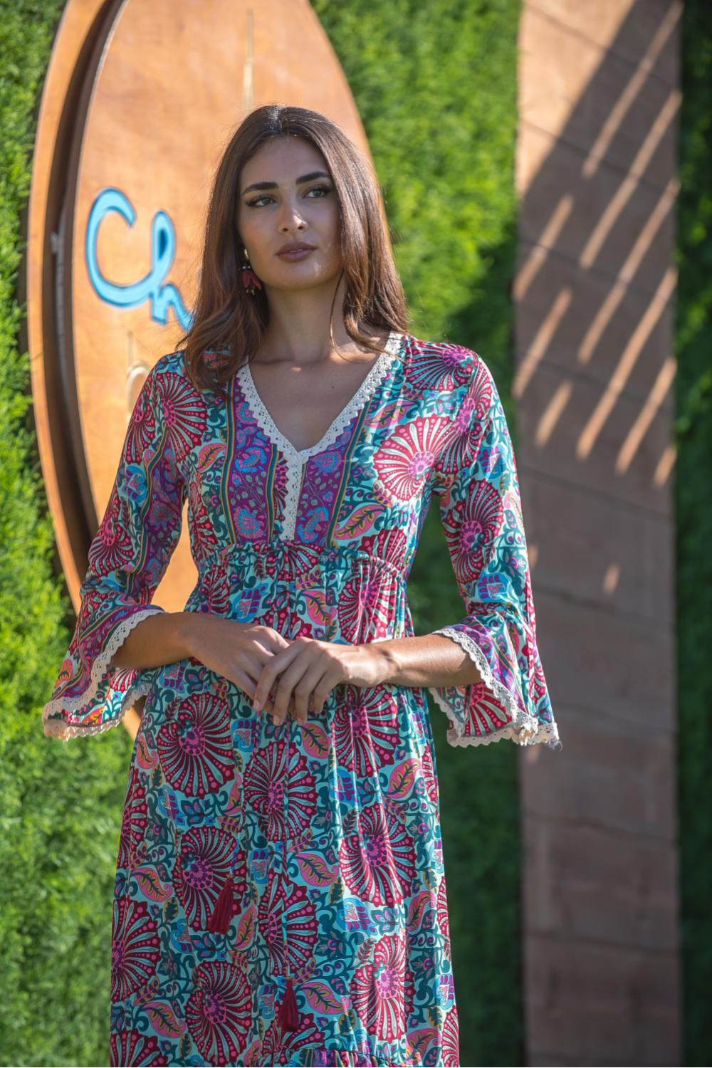 Vestido largo estampado Cielo, celeste con flores pastel, escote pico, mangas francesa terminada en volante fruncido y doble volante en falda.Pasamanería con borlones de flecosCOMPOSICIÓN: 100% VISCOSA