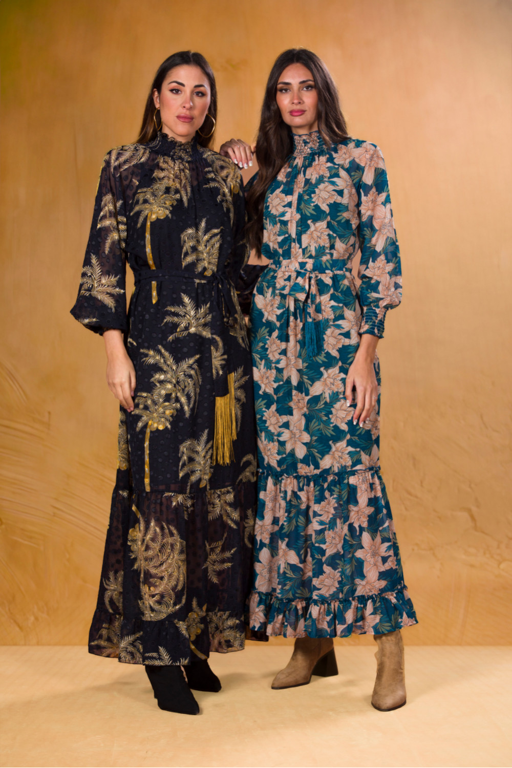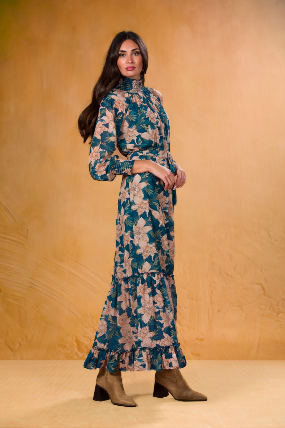 Vestido largo venus azul con flores beige manga larga terminada en puño elástico al igual que el cuello cisne, lleva fajín terminado en flecos al tono.