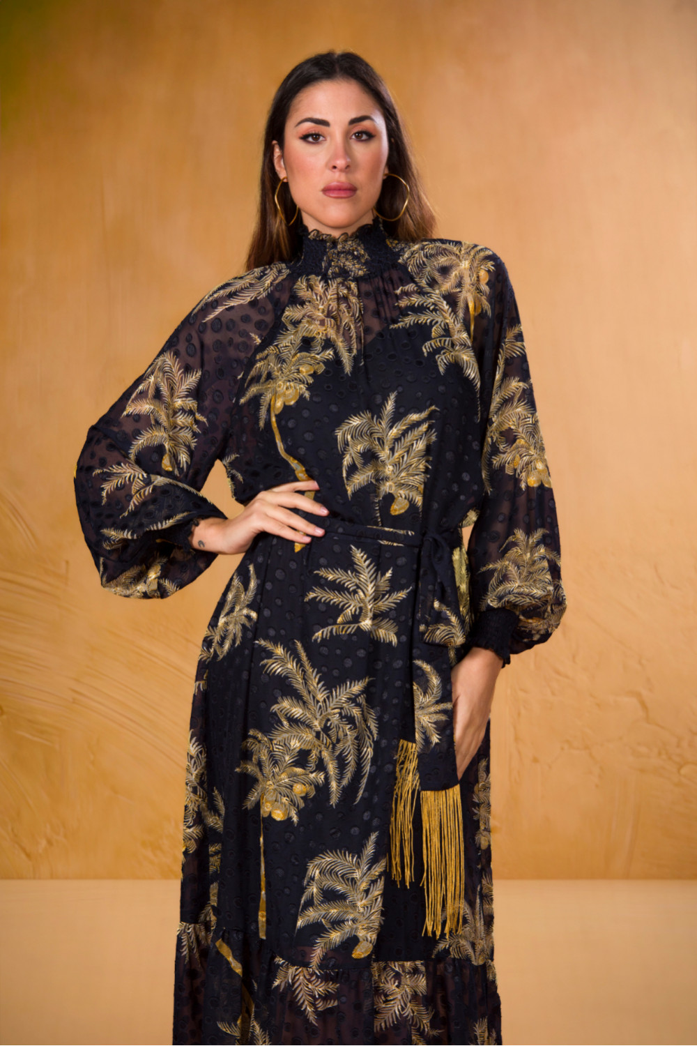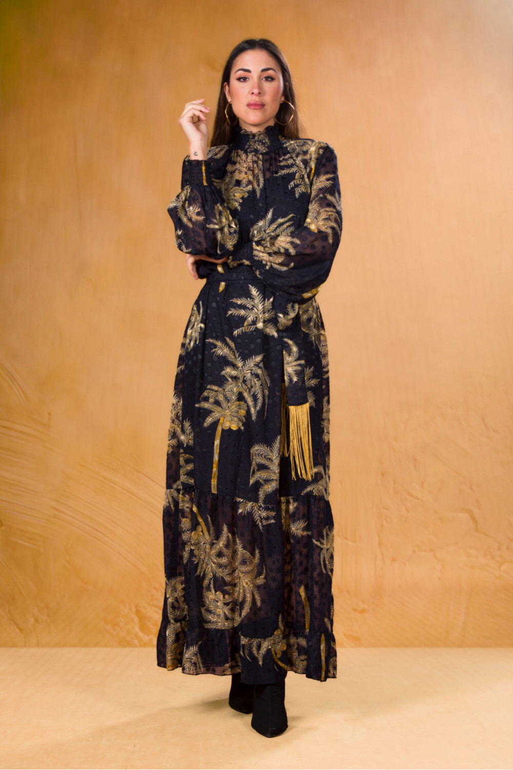 Vestido largo venus de plumeti negro con palmeras doradas manga larga terminada en puño elástico al igual que el cuello cisne, lleva fajín terminado en flecos al tono dorado.