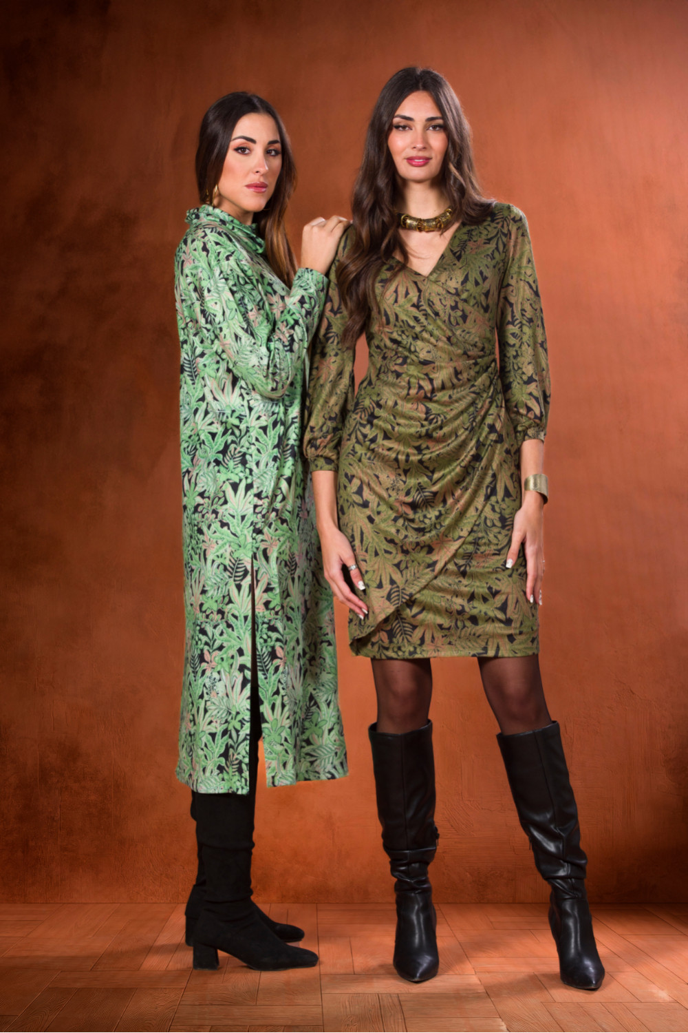 Vestido diana de Jersey, corto con manga larga y cruzado drapeado en la cintura estampado de hojas verdes sobre fondo negro.