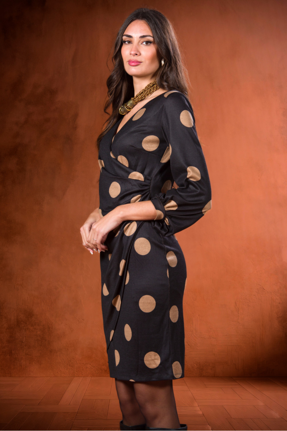 Vestido diana de Jersey, corto con manga larga y cruzado drapeado en la cintura estampado de lunares tostado sobre fondo negro.
