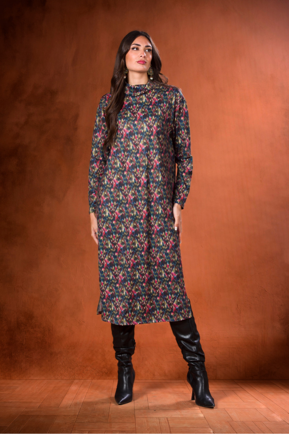Vestido cisne de jersey con cuello alto, largo midi con dos aberturas en los laterales que le dan mayor comodidad en estampado de pinceladas de acuarelas en azules verdes y fucsia.