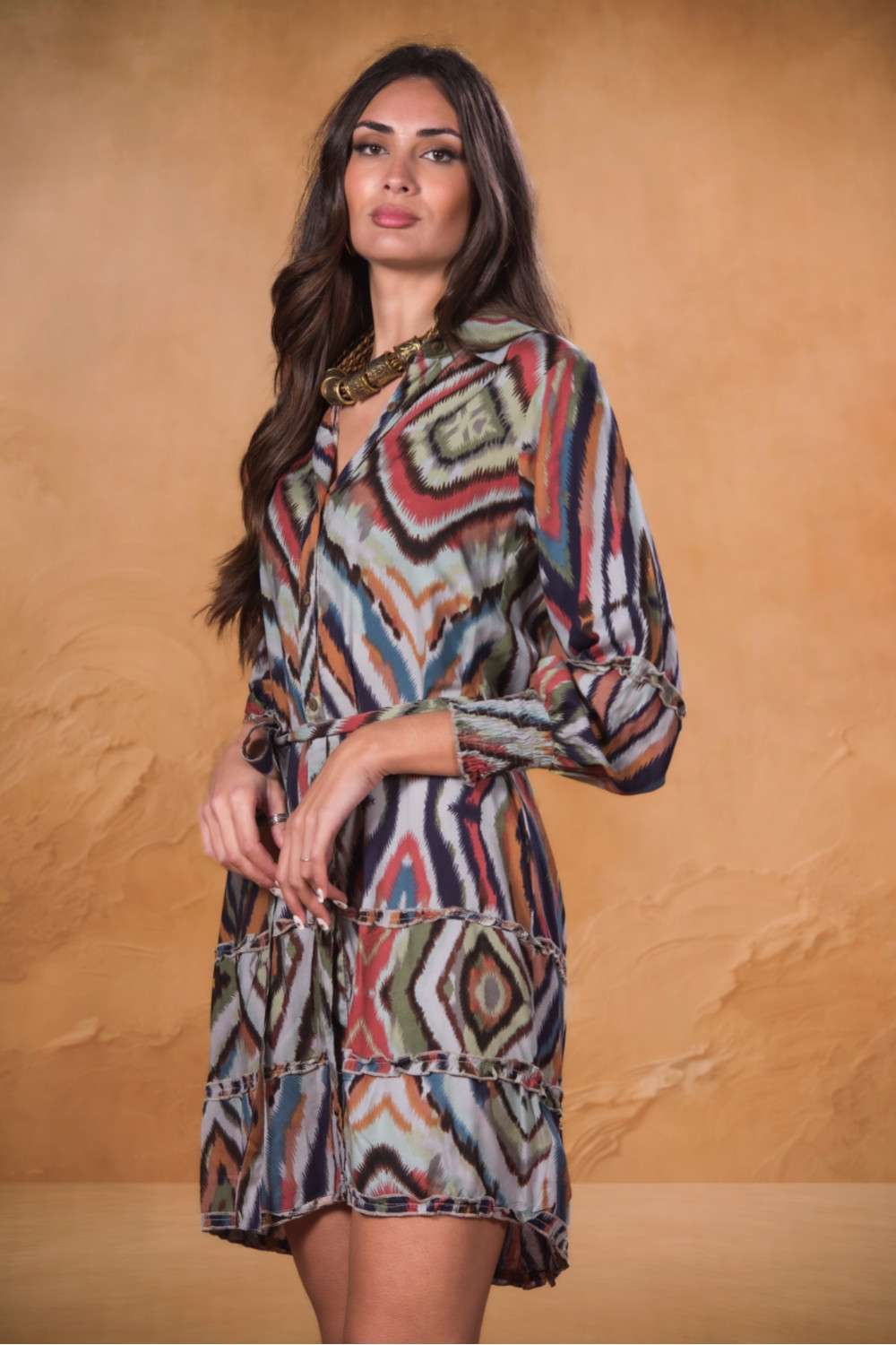Vestido amar corto camisero en estampado haciendo rombos en tonos azules, lima y gris.