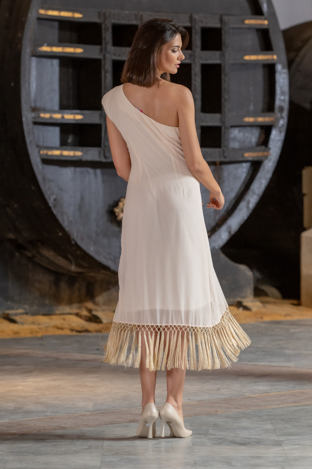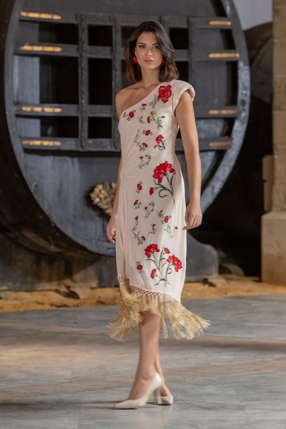 Vestido beige en gasa bordado de claveles rojos , con recogido a un lado y flecos con enrejado al filo. escote asimétrico con hombrera.