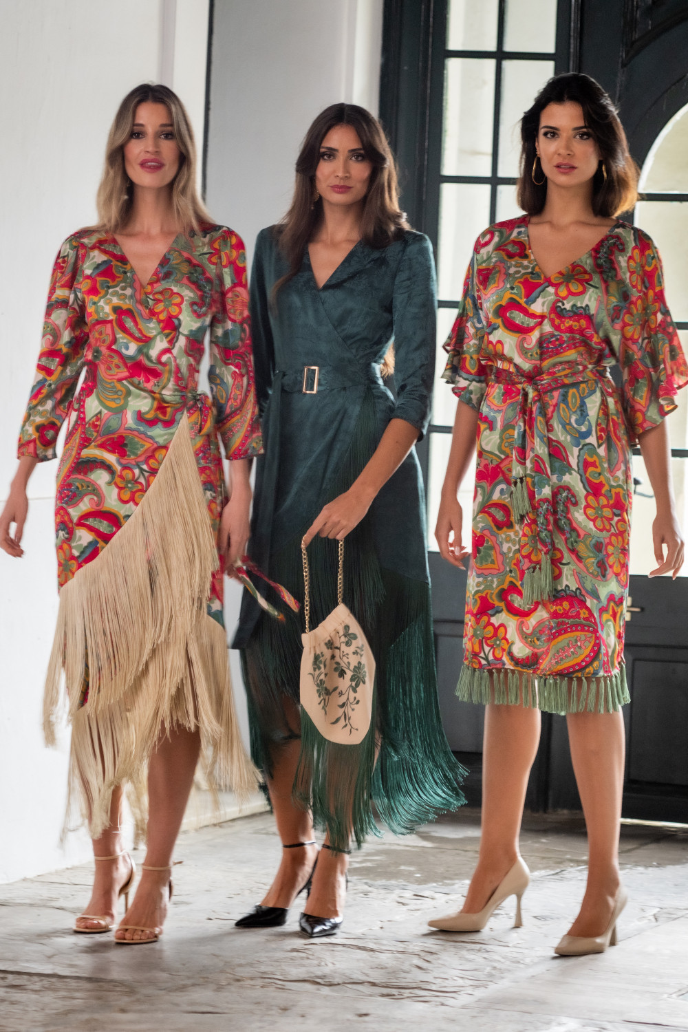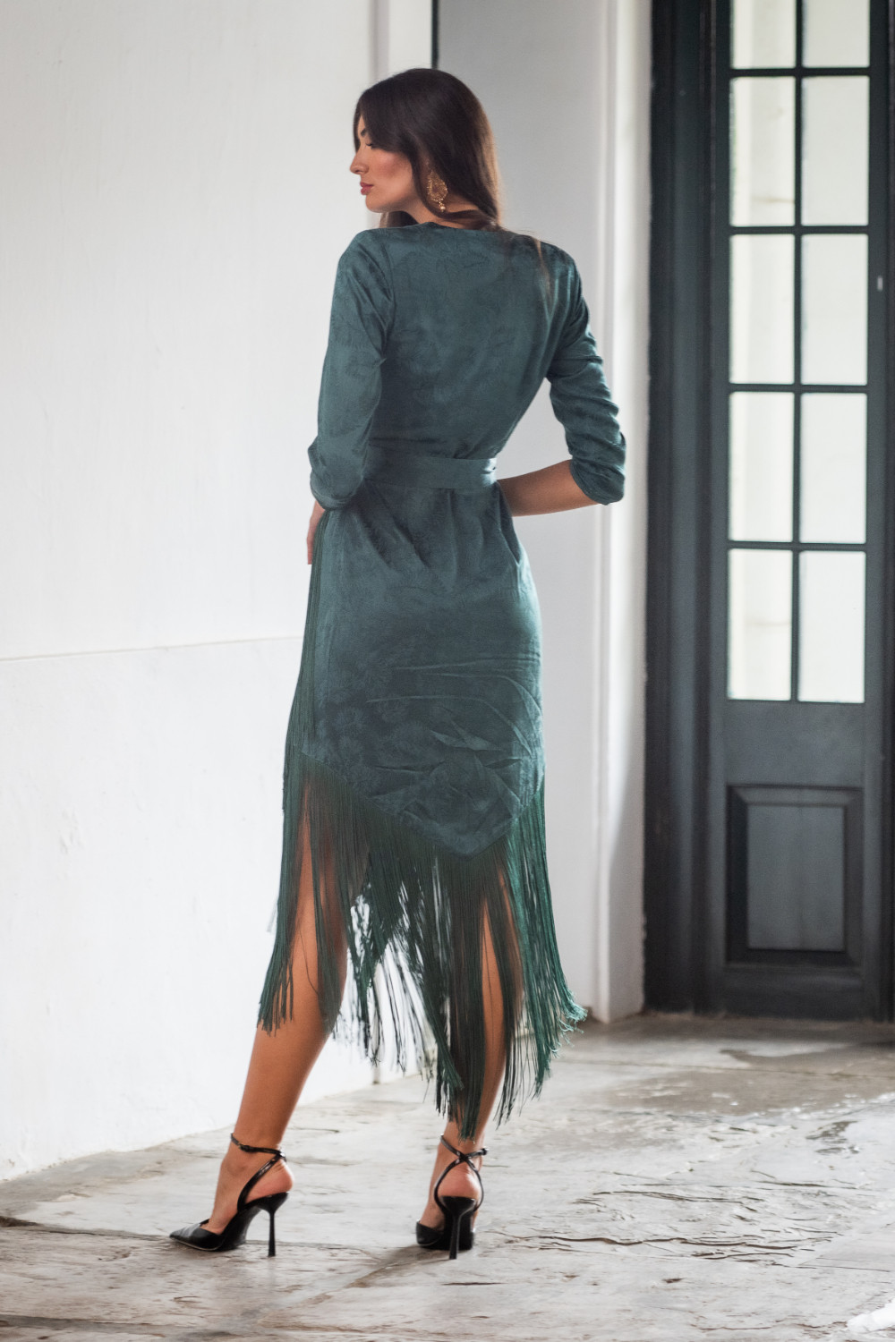 Vestido catavino petróleo cruzado de satén brocado cruzado, media manga con flecos largos y cinturón de hebilla dorada.