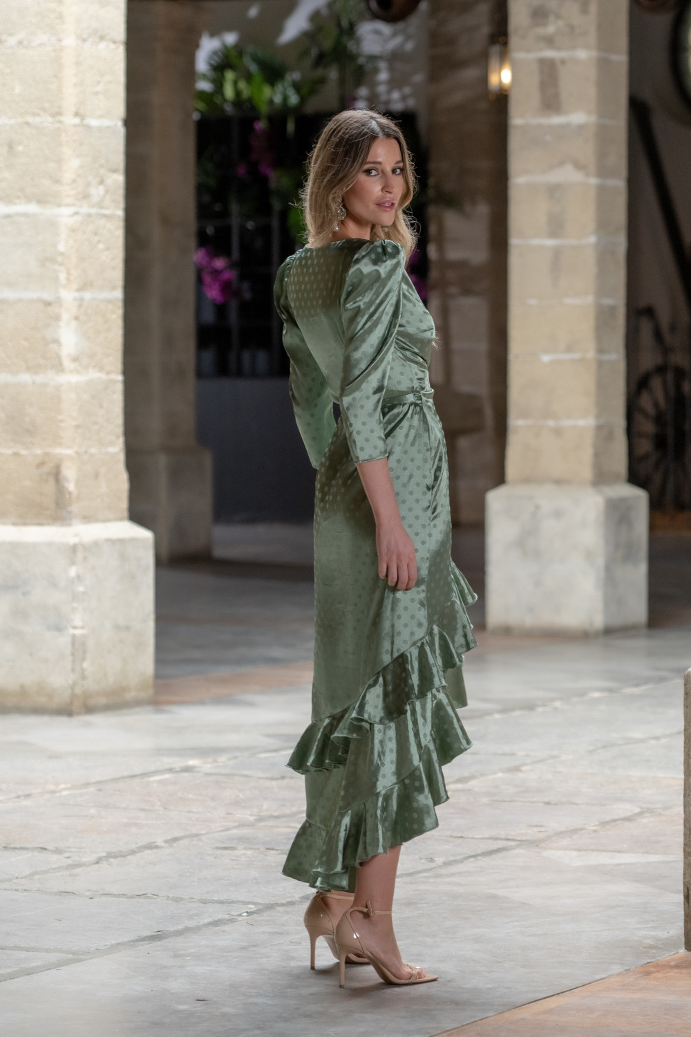 Vestido cream verde de satén liso con lunares al tono, cruzado con volante y media manga.
