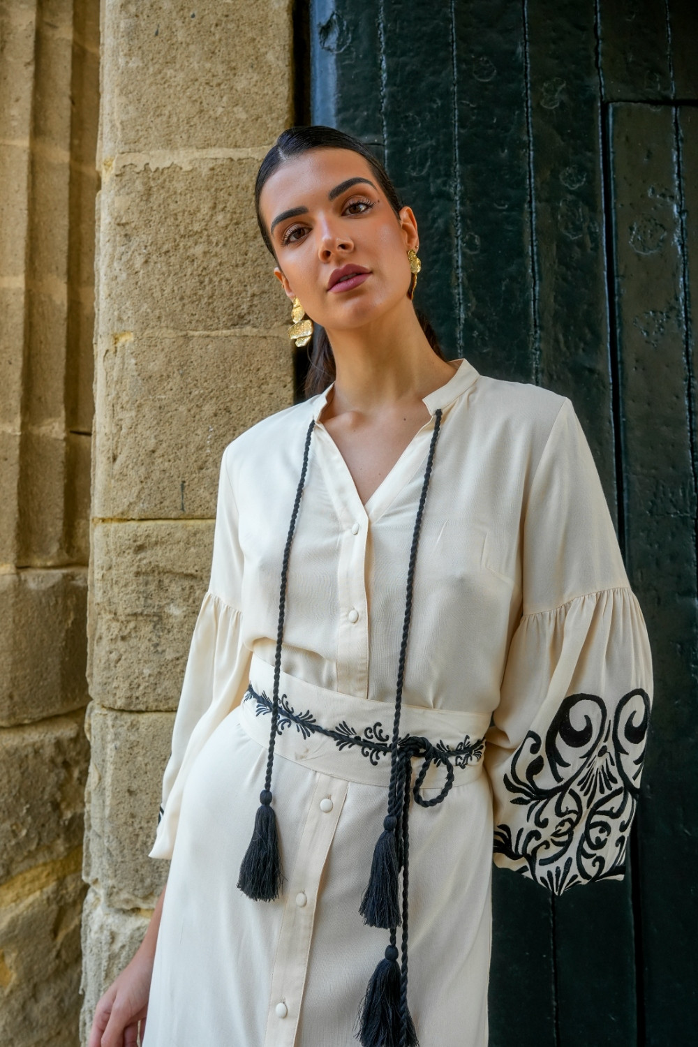 Vestido destino beige camisero de algodón bordado en negro con motivos etnicos y manga larga globo kahyra. COMPOSICIÓN: 100% VISCOSA