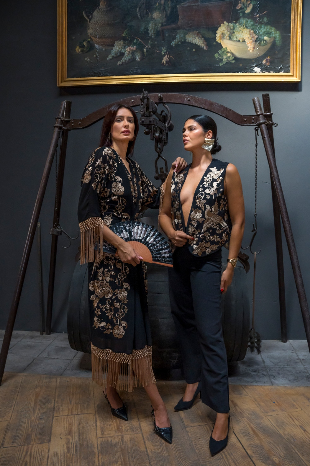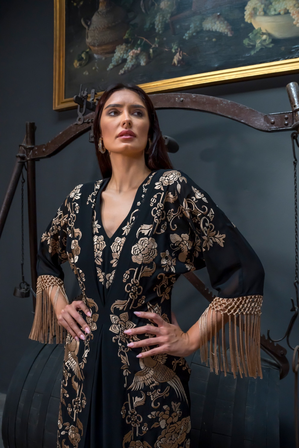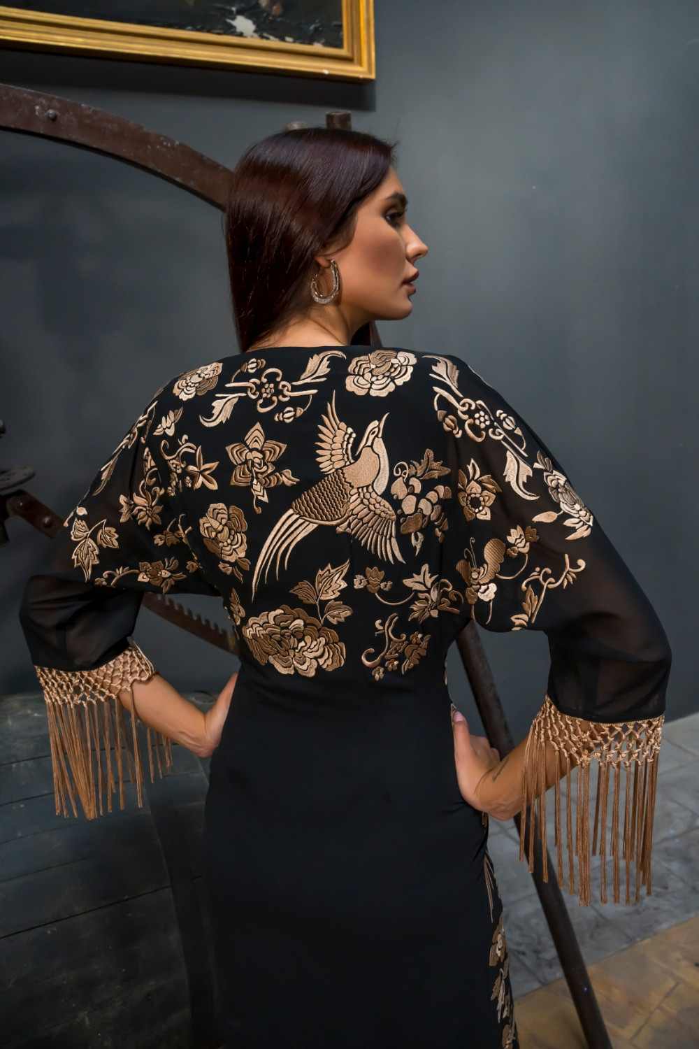 Vestido Manila negro bordado como mantón en hilos beige dorados de largo midi manga japonesa terminado en hilos al tono del bordado Kahyra. COMPOSICIÓN: 100% POLIÉSTER FORRO: 100% POLIÉSTER ACCESORIOS: FLECOS 100% VISCOSA