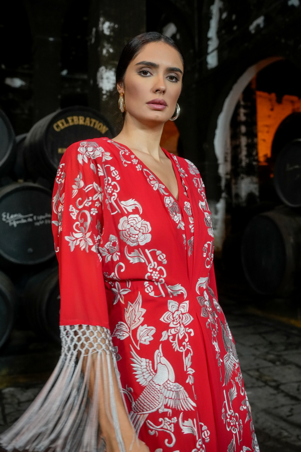Vestido Manila rojo bordado como mantón en hilo gris dorados de largo midi manga japonesa terminado en hilos al tono del bordado Kahyra. COMPOSICIÓN: 100% POLIÉSTER FORRO: 100% POLIÉSTER ACCESORIOS: FLECOS 100% VISCOSA