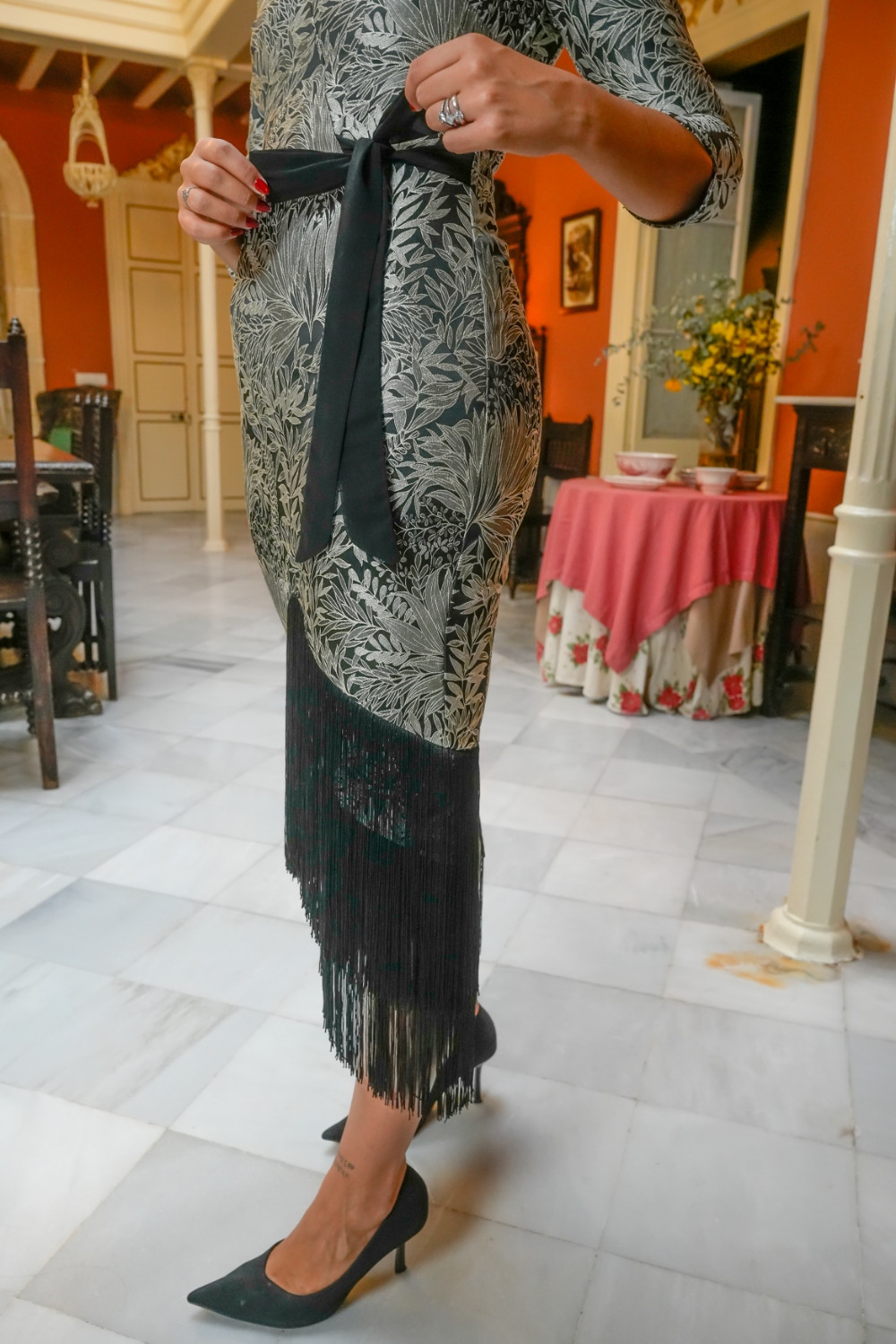 Vestido suspiro negro de tejido brocado con hilo dorado y manga francesa. escote en v y terminado en flecos al tono Káhyra. COMPOSICIÓN: 75%POLIÉSTER 25% HILO METALICO FORRO: 100% POLIÉSTER ACCESORIOS: 100% POLIÉSTER