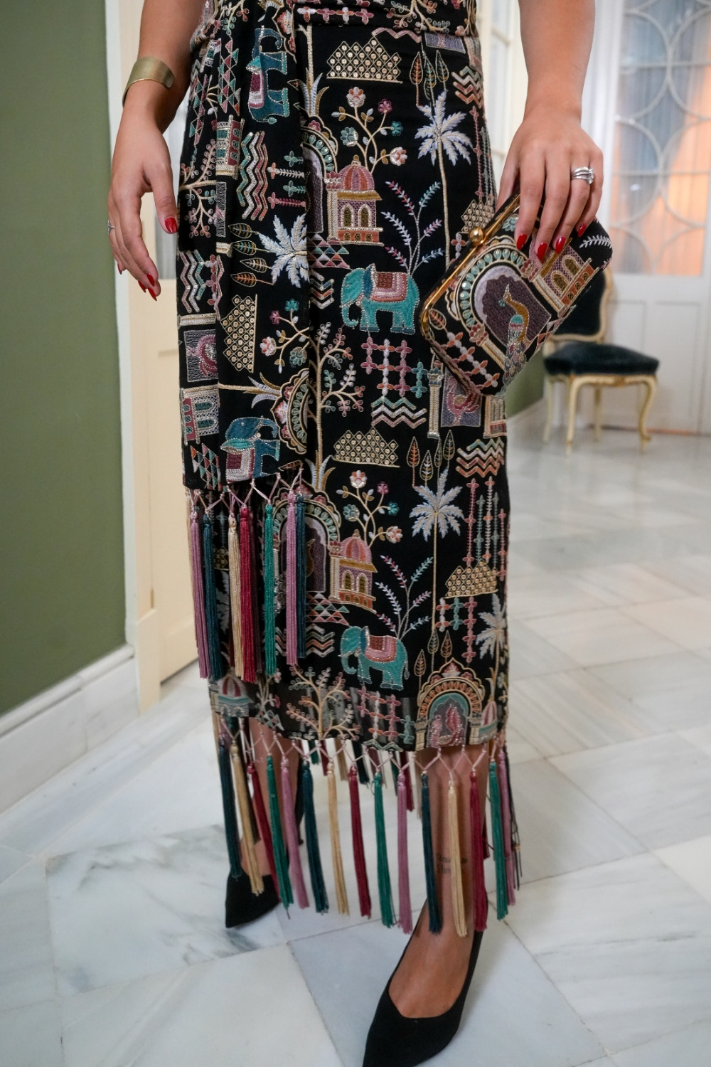 Vestido india negro de tejido especial bordado con motivos indios. elefantes. pavos reales. templetes. sin manga cogido al cuello y flecos de borlones al tono de los bordados Káhyra.