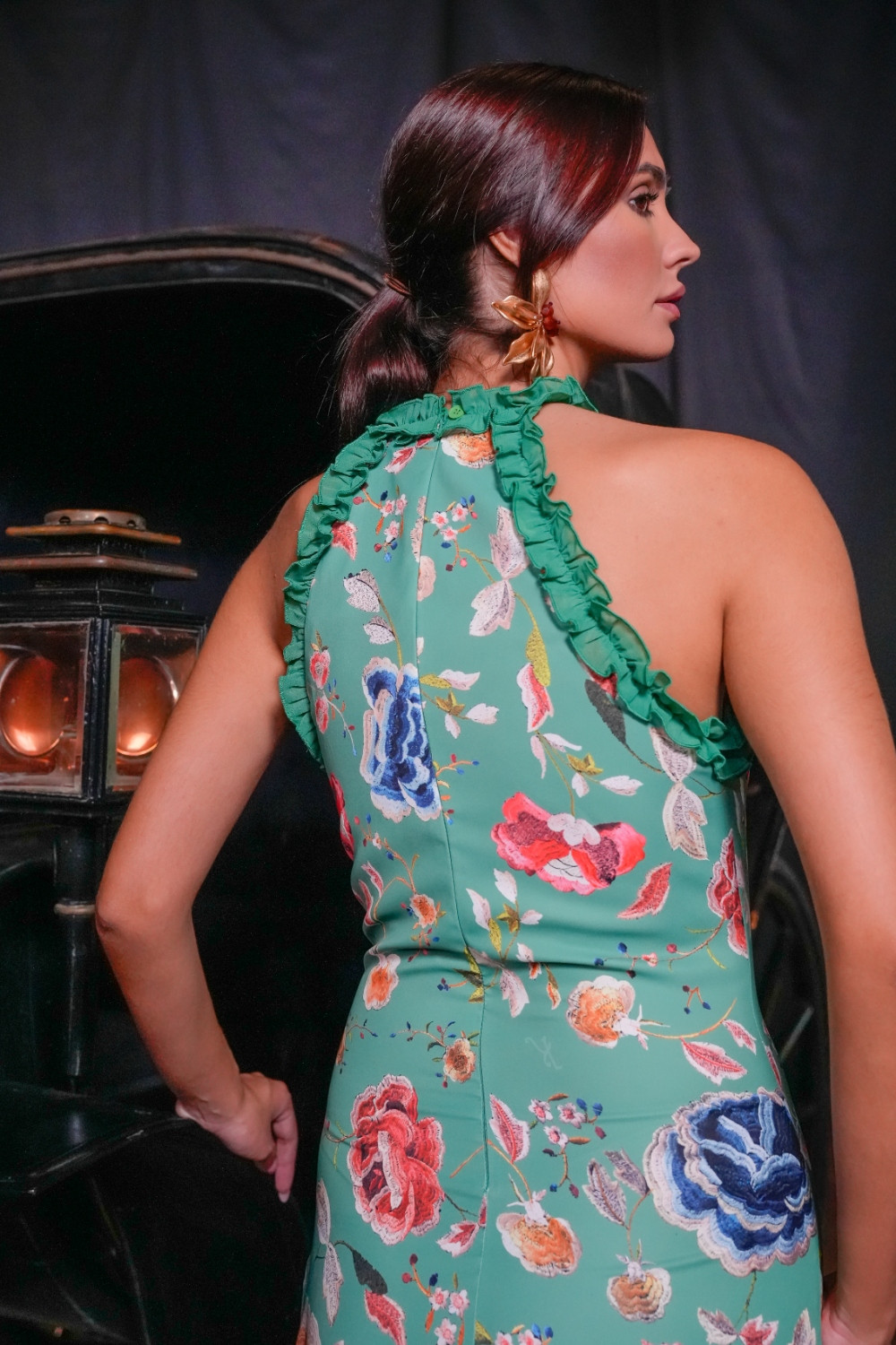 Vestido Princesa Mantón Verde Andalucía Estampado cuello halter con carruchitas alrededor cuello y sisa. COMPOSICIÓN: 100%POLIÉSTER