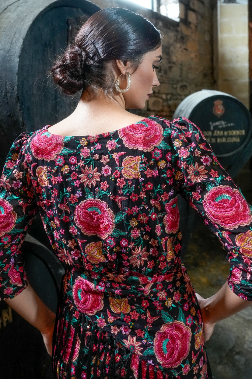 Vestido Feria negro de tejido de gasa bordado con flores en tonos rojo, fucsia y coral de media manga, escote en v y fajín mantoncillo anudado en la cintura Káhyra.