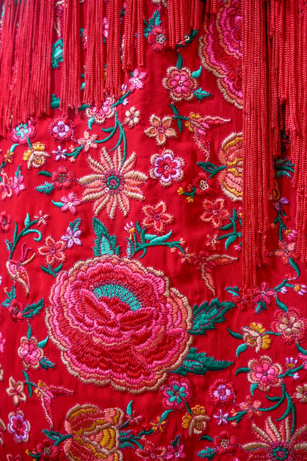 Vestido Feria rojo de tejido de gasa bordado con flores en tonos rojo. fucsia y coral de media manga. escote en v y fajín mantoncillo anudado en la cintura Káhyra. COMPOSICIÓN: 100% POLIÉSTER FORRO: 100% POLIÉSTER ACCESORIOS: FLECOS 100% VISCOSA