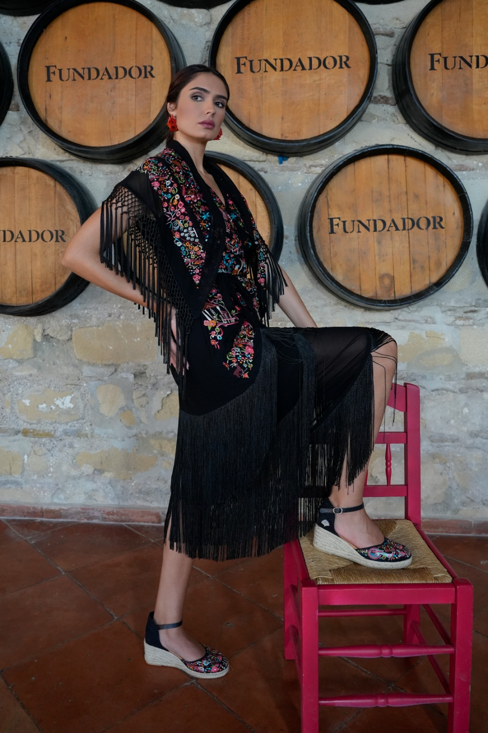 Referencia: AL0003CAlpargata esparteña Loto negro bordada mantón antiguo con motivos chinos Kahyra