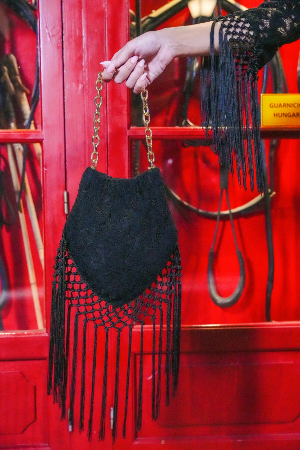 Referencia: BG0126FBolso Saeta negro limosnera de encaje con flecos al tono kahyra