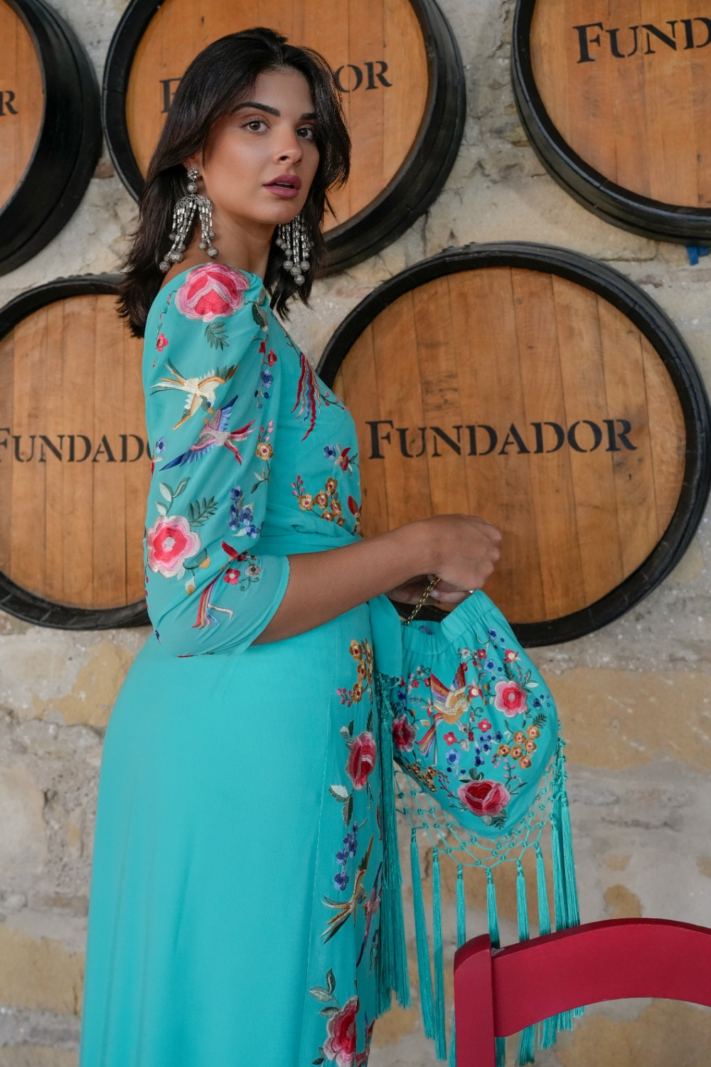 Referencia: BG0128BBolso Dalia limosnera con flecos bordado mantón flores y pajaro de colores sobre fondo aqua káhyra