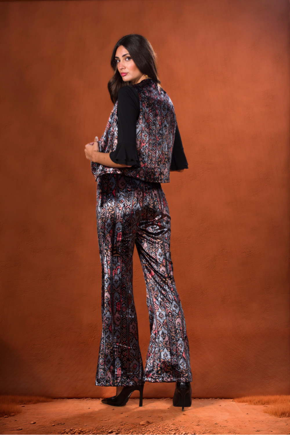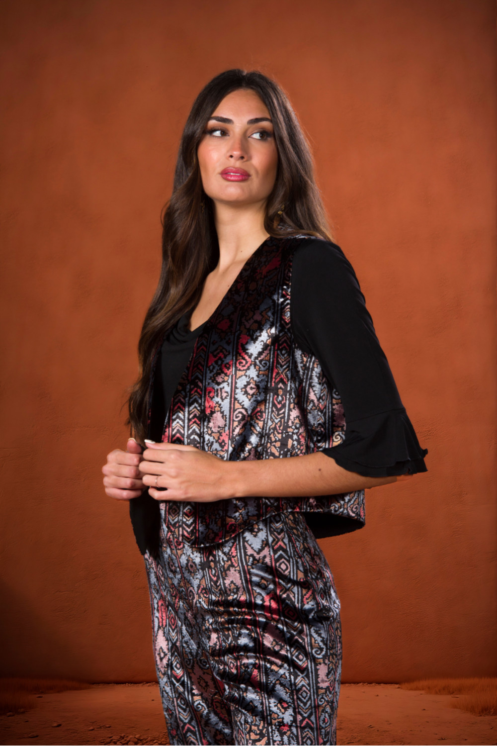 Vestido largo vesta cachemir azules cruzado combinado con estampado animal de rayas en tonos negro y gris claro.COMPOSICIÓN: 100% POLIESTER