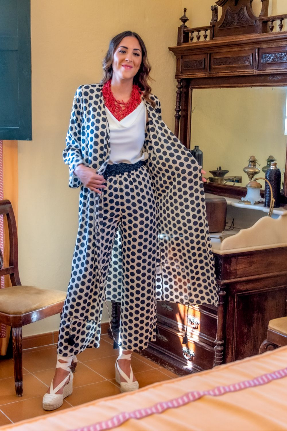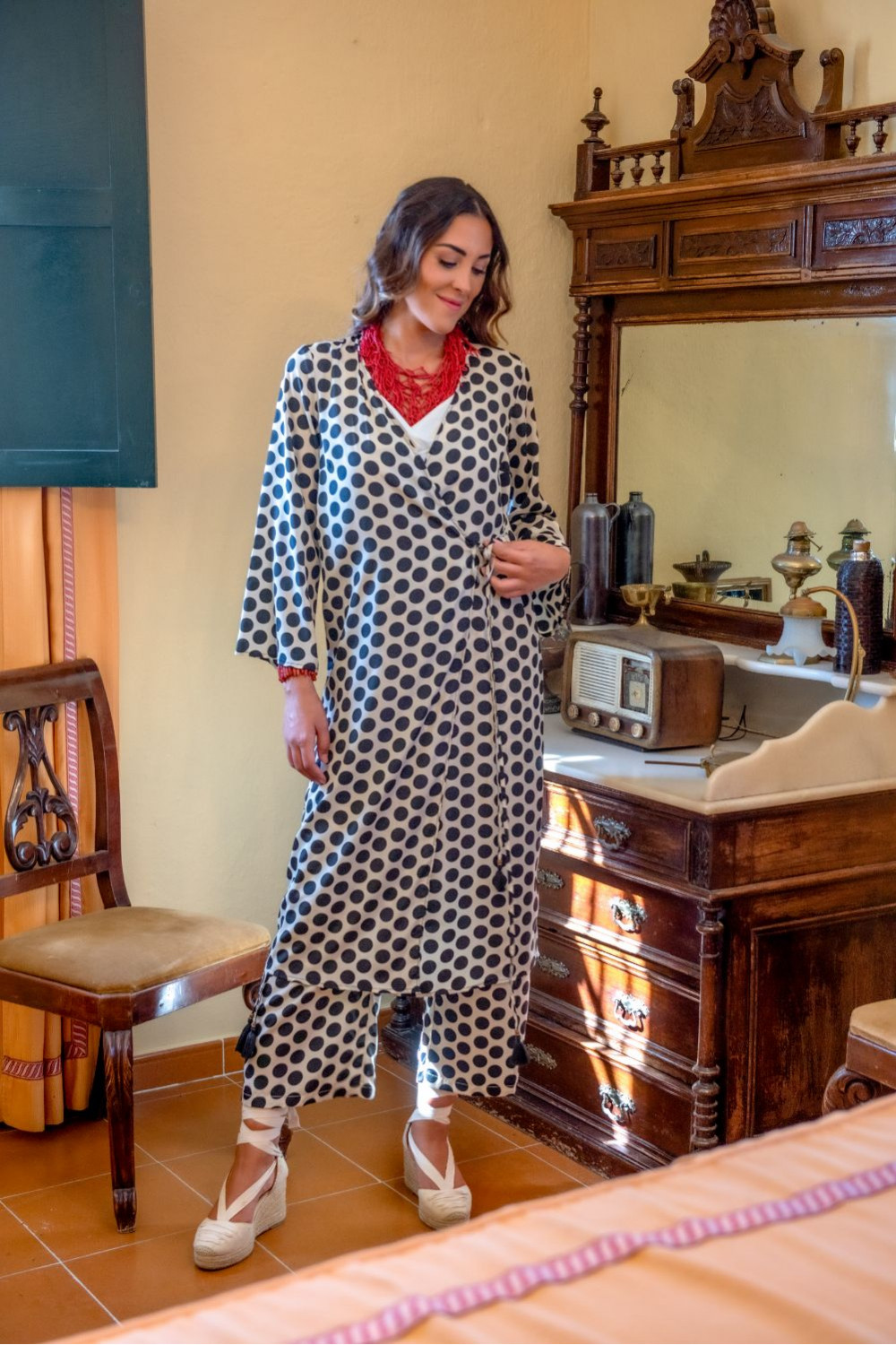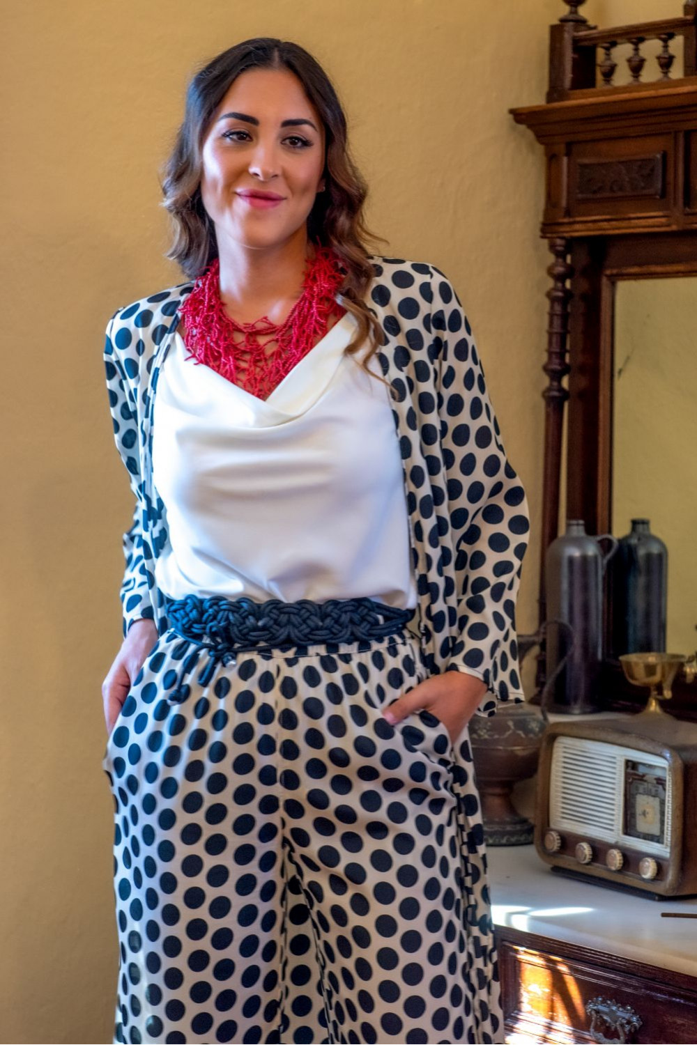 Chaqueta kimono solera de polysilk fondo crudo y lunares negros.
