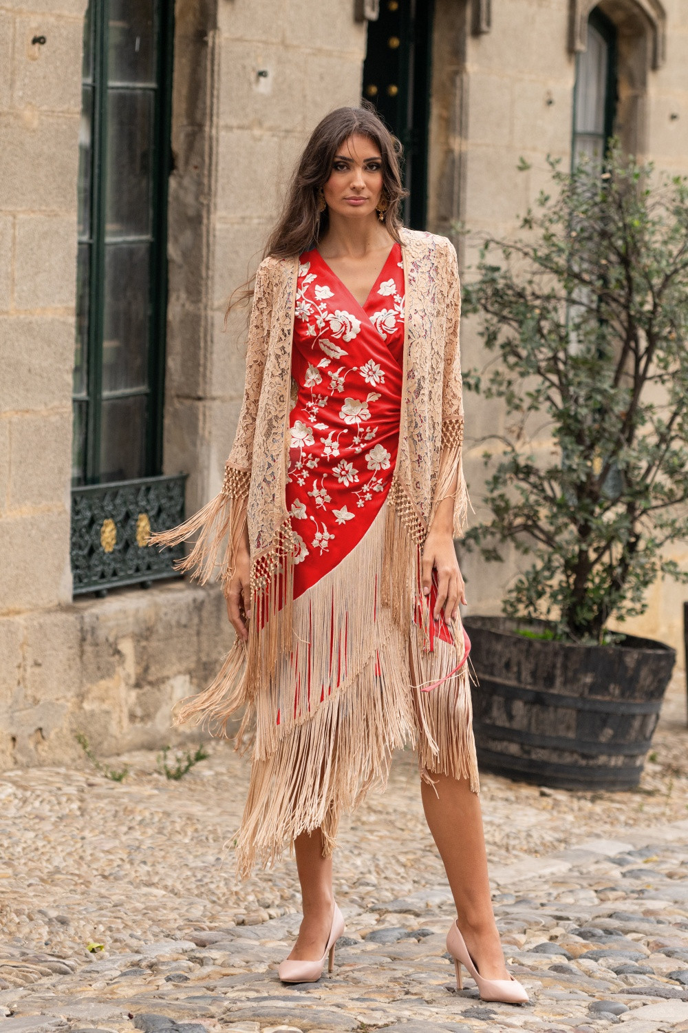 Chaqueta negra encaje terminada en flecos enrejados en mangas y filo.Calidad: 100% Poliéster - Flecos: 100% Poliéster