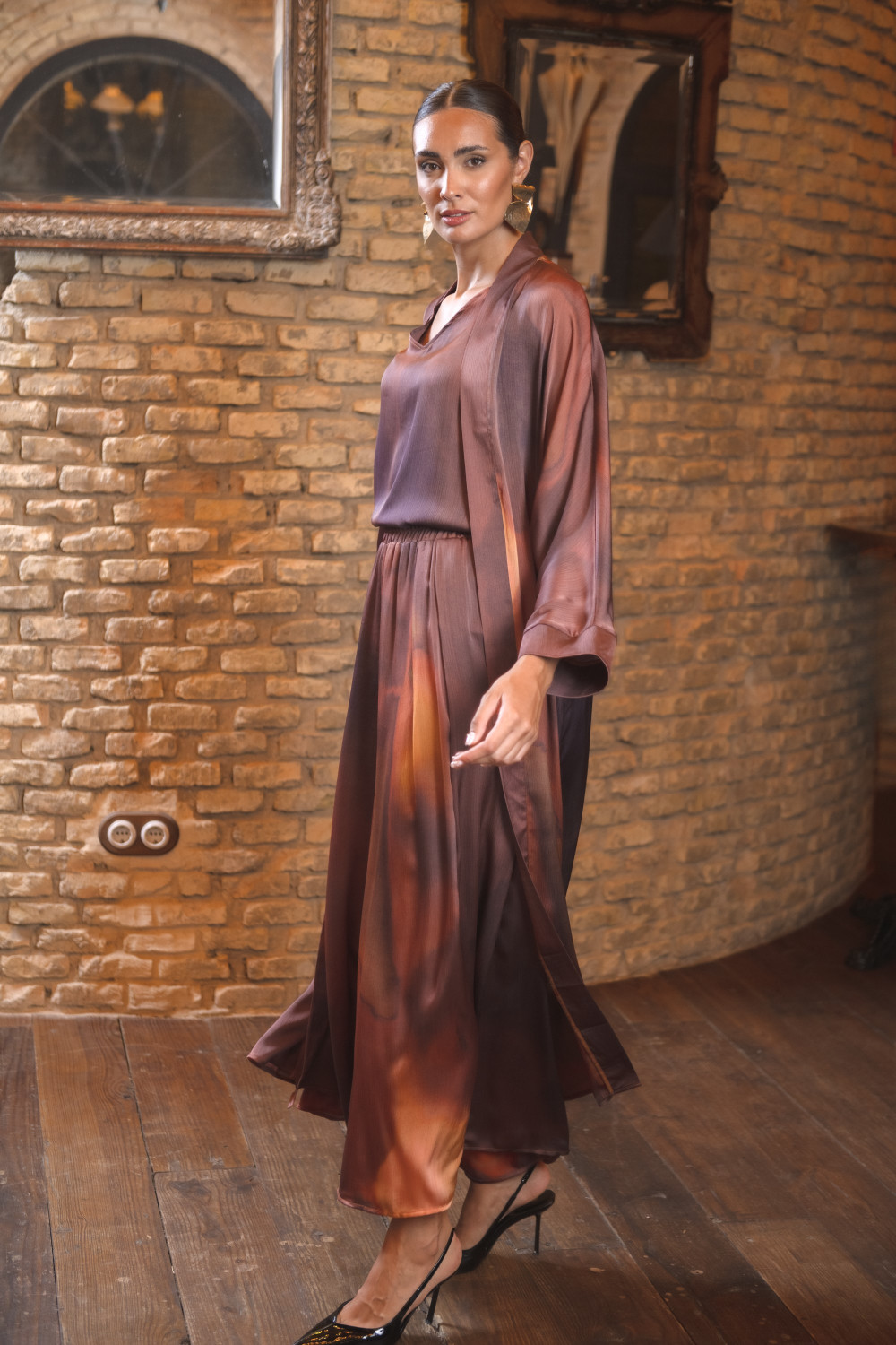 Referencia: C0246AConjunto 3 piezas Canela kurta. pantalón y top polisilk berenjena y marrón en degrade