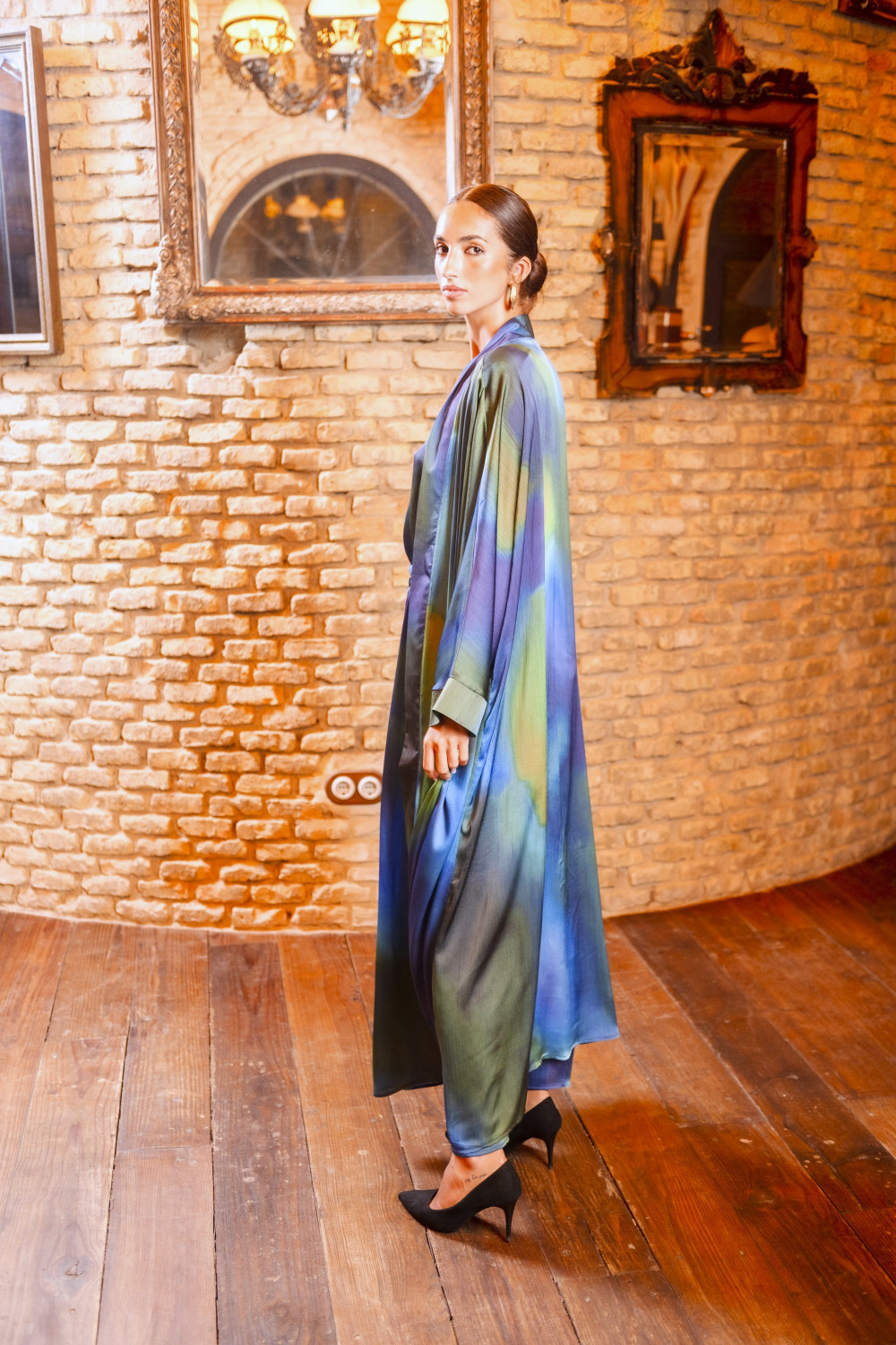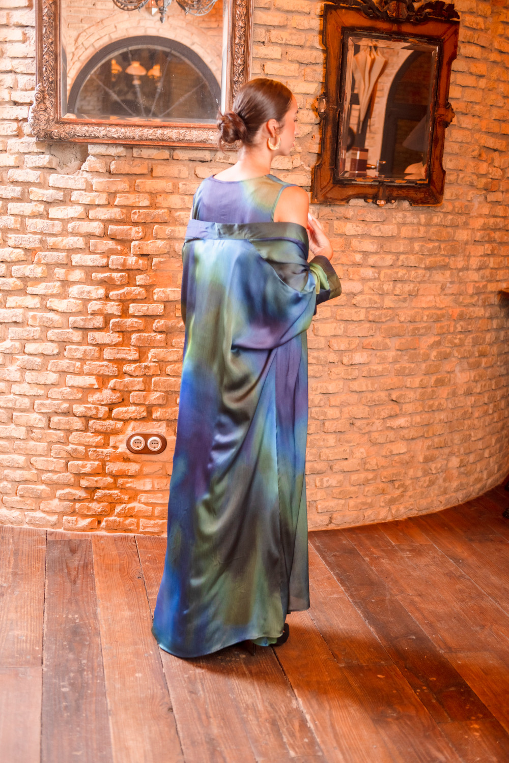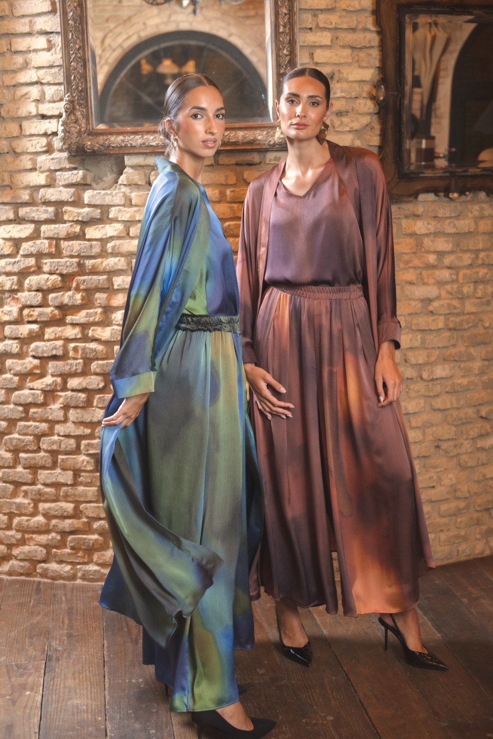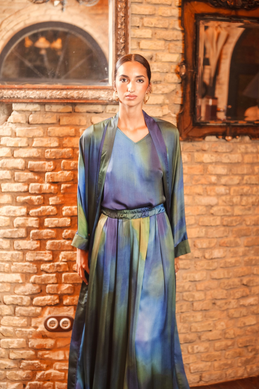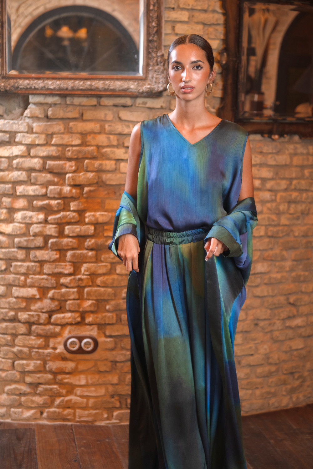 Referencia: C0246BConjunto 3 piezas Canela kurta. pantalón y top polisilk verde y azul en degrade