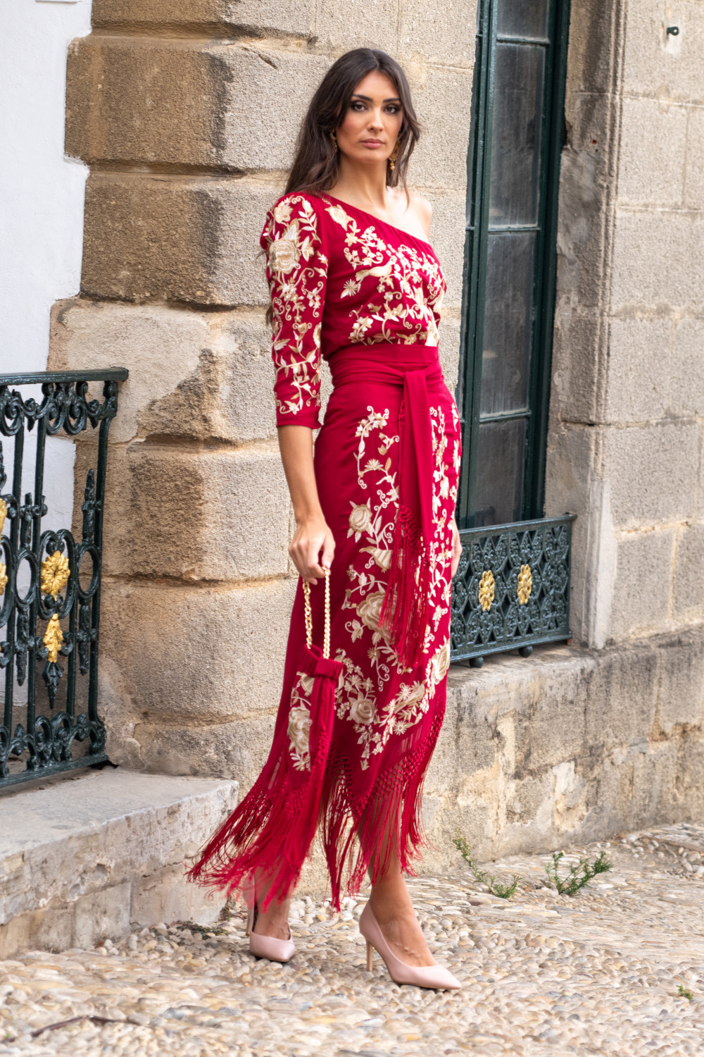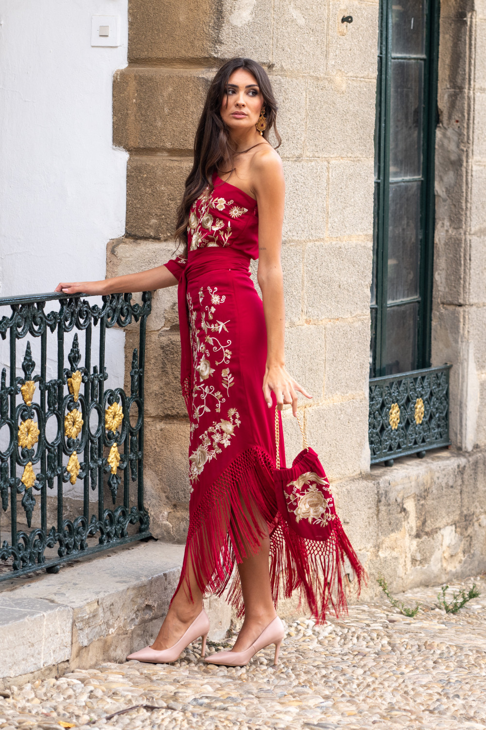 Falda burdeos bordada de flores mantón en tonos beige y pájaros, con flecos enrejados en el filo y pico lateral.