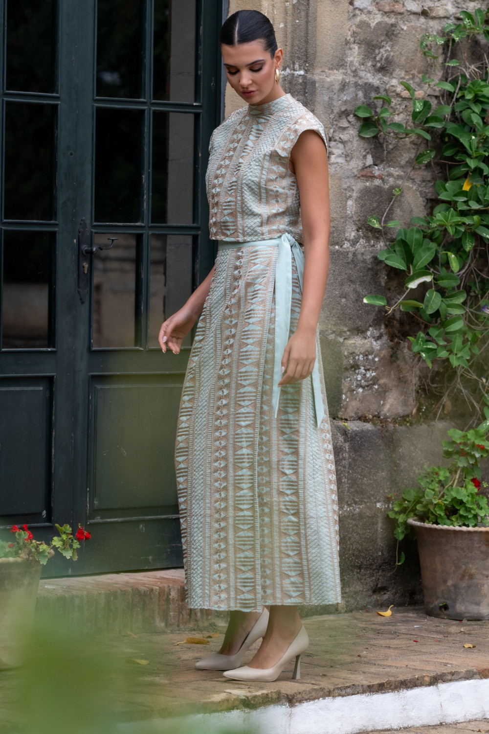 Top aqua abierto por detrás abotonado, Tejido con bordado geométrico en hilo metálico de color bronce.Calidad: 50% Algodón 50% Poliéster - Forro: 80% Poliéste 20%Algodón
