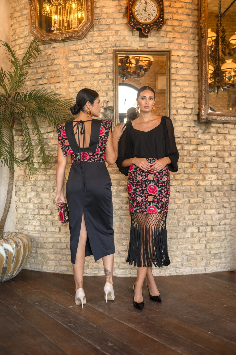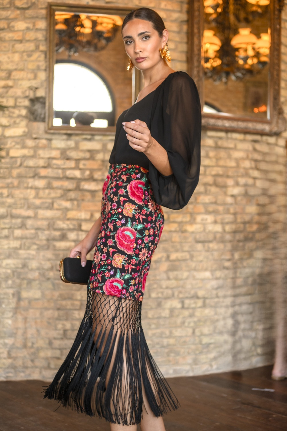 Falda Feria negro de gasa bordado con flores en tonos rojo, fucsia y coral terminada en flecos negros Káhyra.