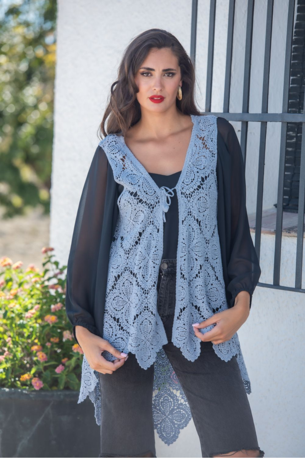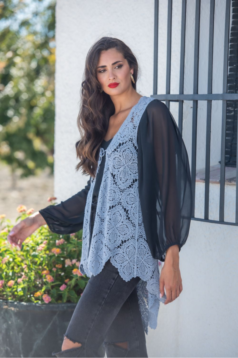 Chaqueta Mantón de manila negra flores beige con mangas largas, abierta con nudo y largo midi.COMPOSICIÓN: 70% POLIESTER 30% SEDA