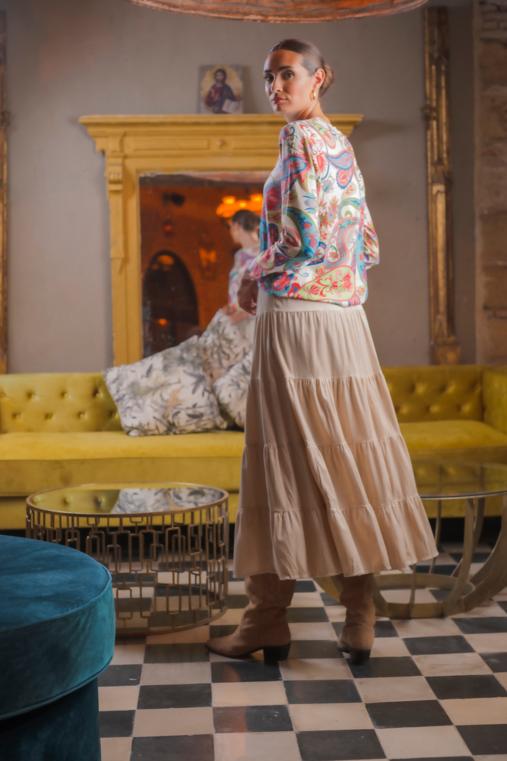 Referencia: JE0056AJersey Jungly cashemir de colores y fondo beige con cuello a la caja