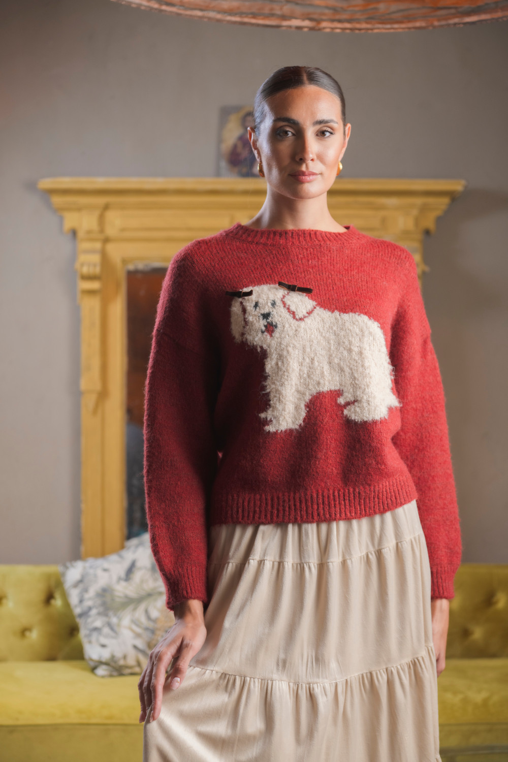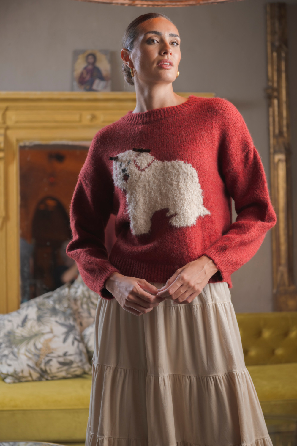 Referencia: JE0061AJersey de lana fondo burdeos con perrito beige cuello a la caja