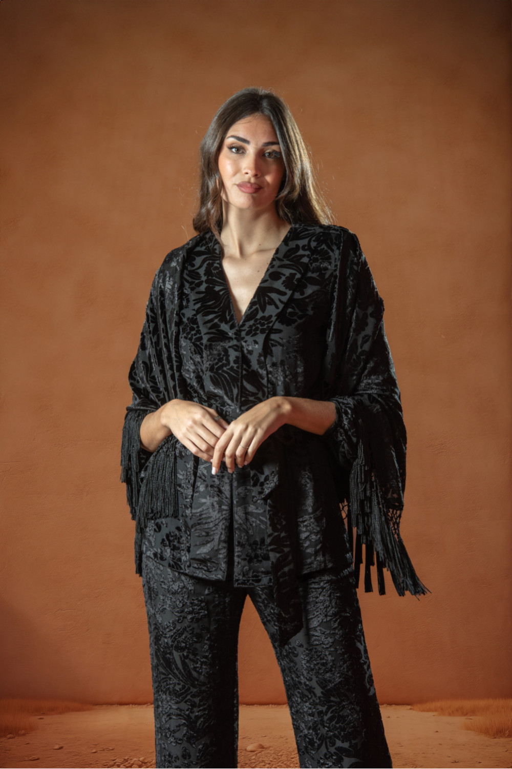 Chaqueta velvet de gasa con dibujos de terciopelo en negra, de manga larga globo abierta con solapa cruzada.COMPOSICIÓN: 100% POLIESTER
